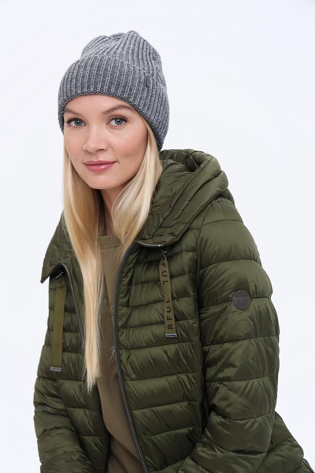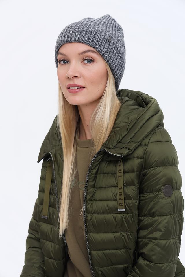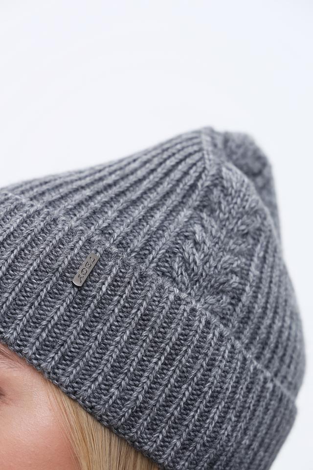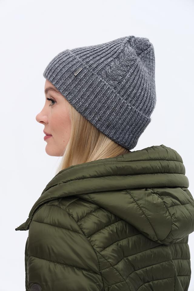 Вязаная текстура шапки придает ей стильный и современный вид. Преобладающий серый цвет легко сочетается с различными элементами гардероба, позволяя создавать разнообразные образы.
