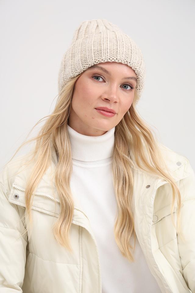 Бежевая вязаная шапка Adel из шерсти и акрила. Мягкий и тёплый аксессуар для создания уютного образа. Состав: 50% шерсть, 50% акрил. Состав: шерсть 50%, акрил 50%