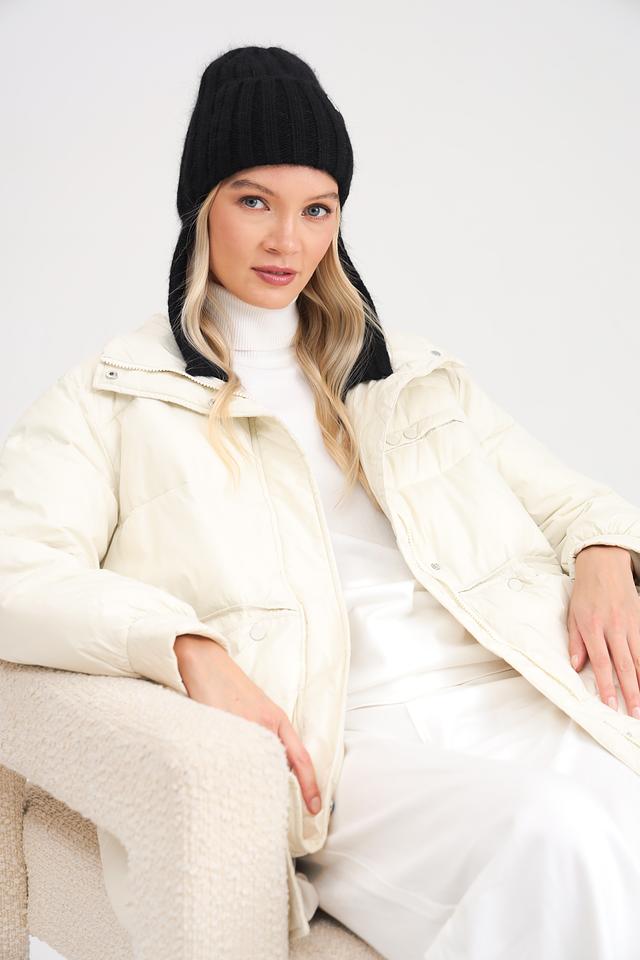 Состав шапки: 40% полиамид и 60% ангора. Такое сочетание материалов обеспечивает не только тепло, но и мягкость, приятную на ощупь. Вязаная текстура добавляет шапке объём и уют.