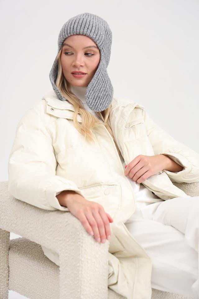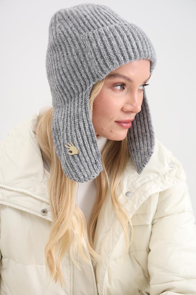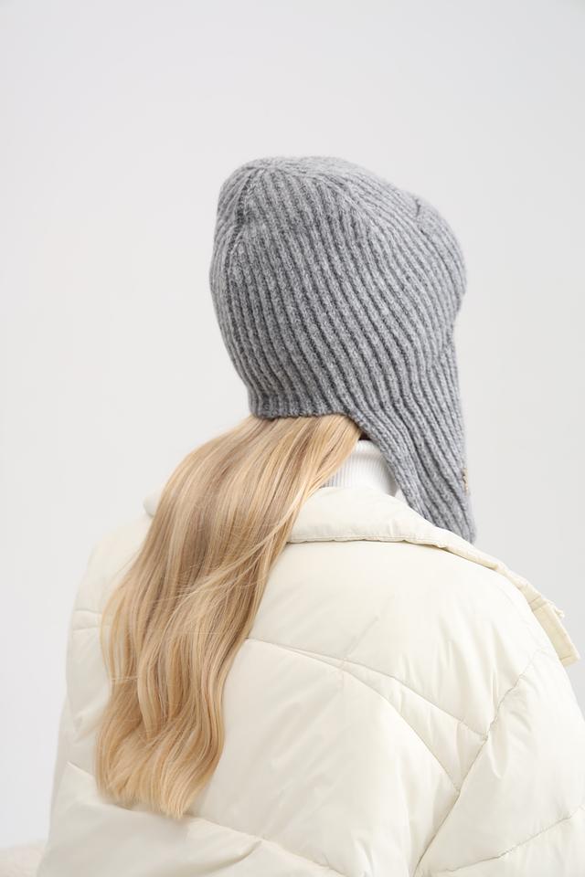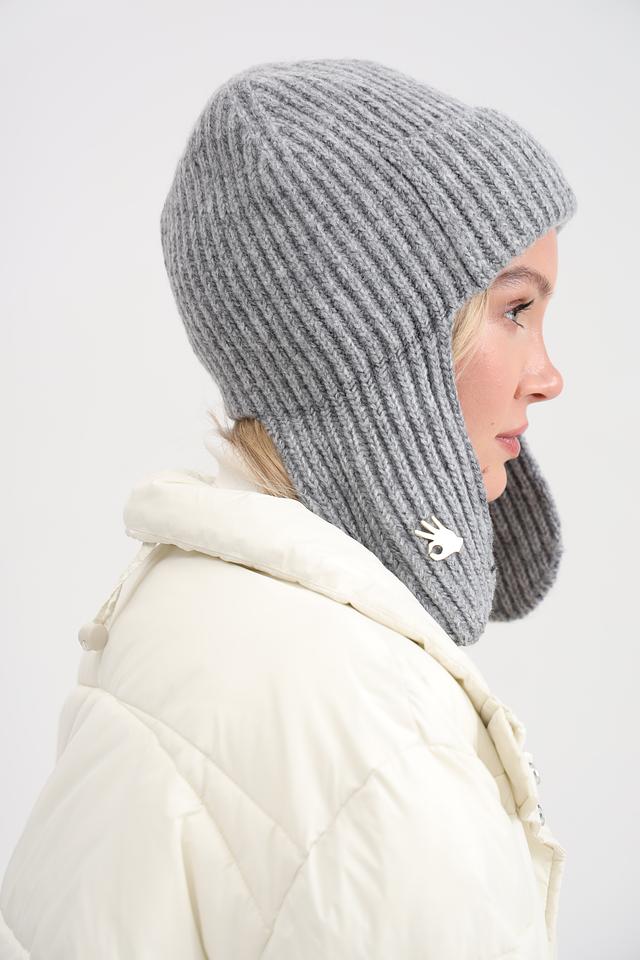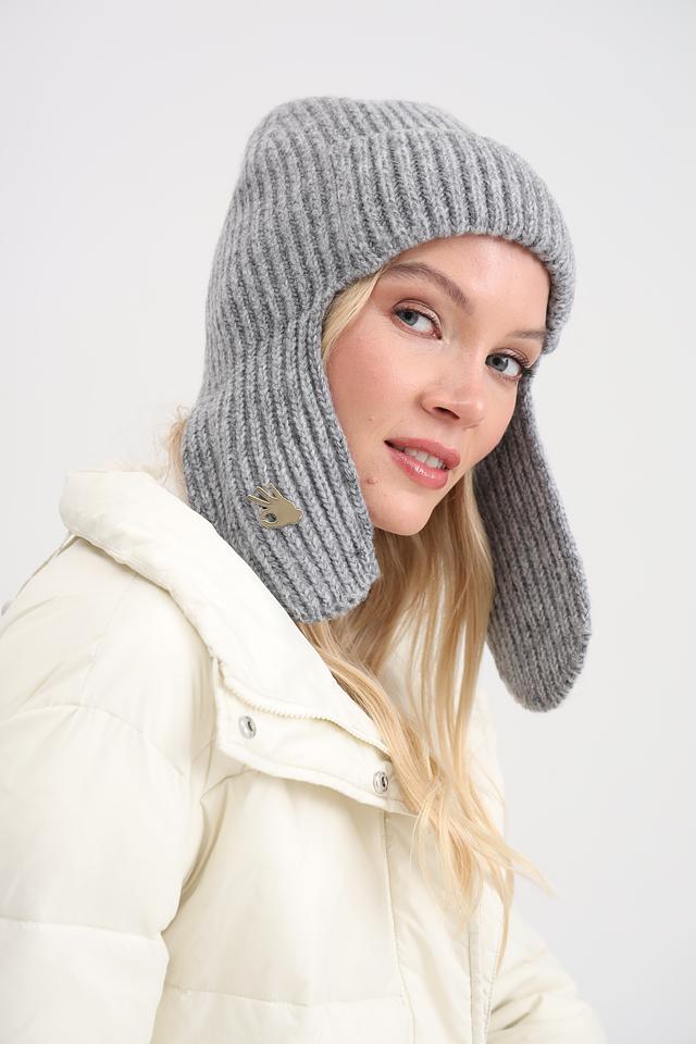 Шапка имеет классический серый цвет и плотную вязку, которая хорошо держит форму. Ушки защитят от ветра и мороза, а декоративный элемент в виде металлической броши придаёт шапке особый шарм.