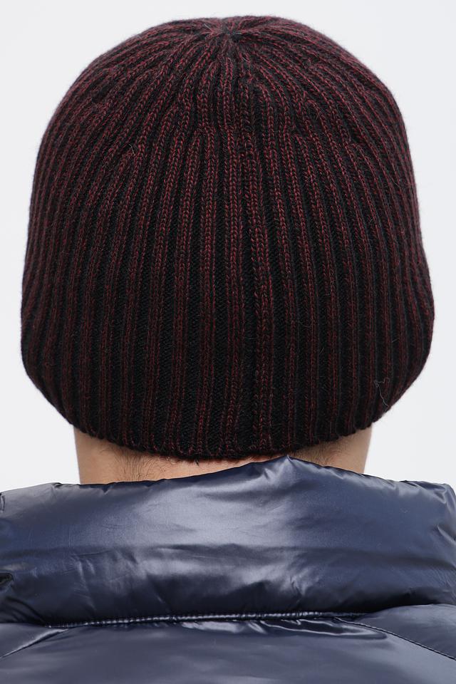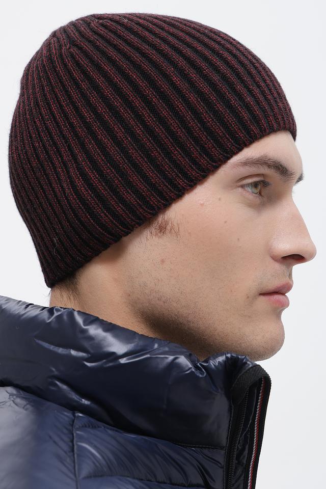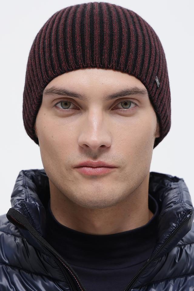 Шапка имеет облегающую форму и плотную вязку, что обеспечивает комфортную посадку и хорошую теплоизоляцию. Дизайн шапки выполнен в сочетании черного и красного цветов, что придает ей стильный и современный вид.