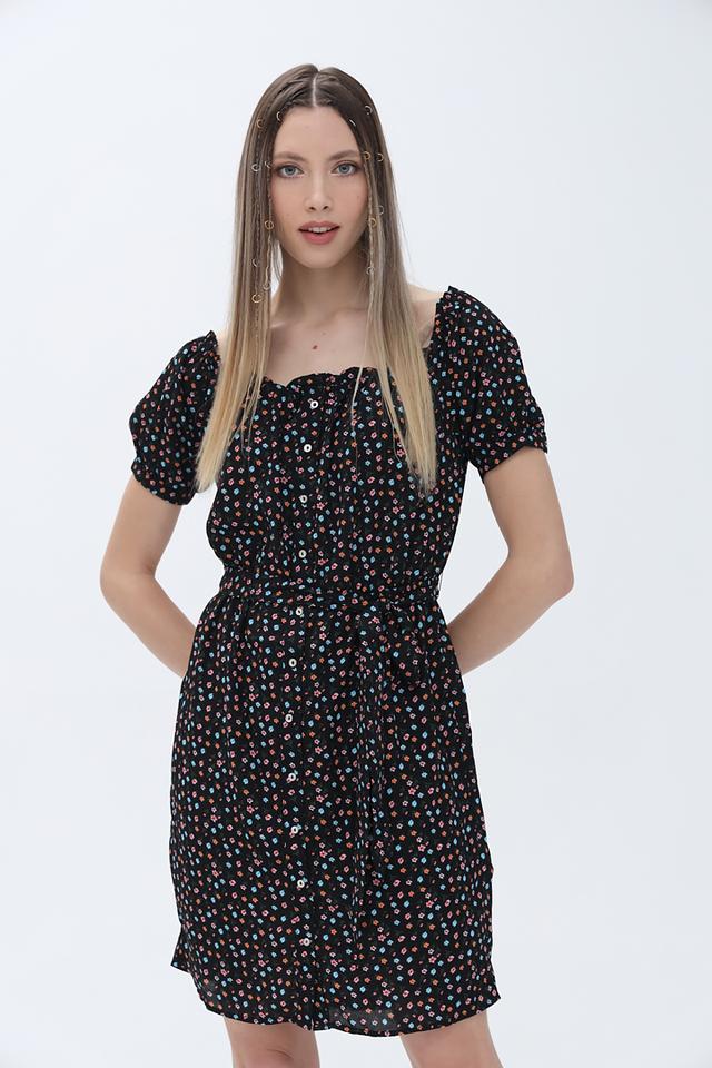 Платье Alcott чёрного цвета с ярким цветочным принтом – отличный выбор для создания лёгкого и женственного образа. Модель выполнена из полиэстера, имеет короткий рукав и эластичную резинку на талии, что обеспечивает комфортную посадку. Состав: полиэстер 100%