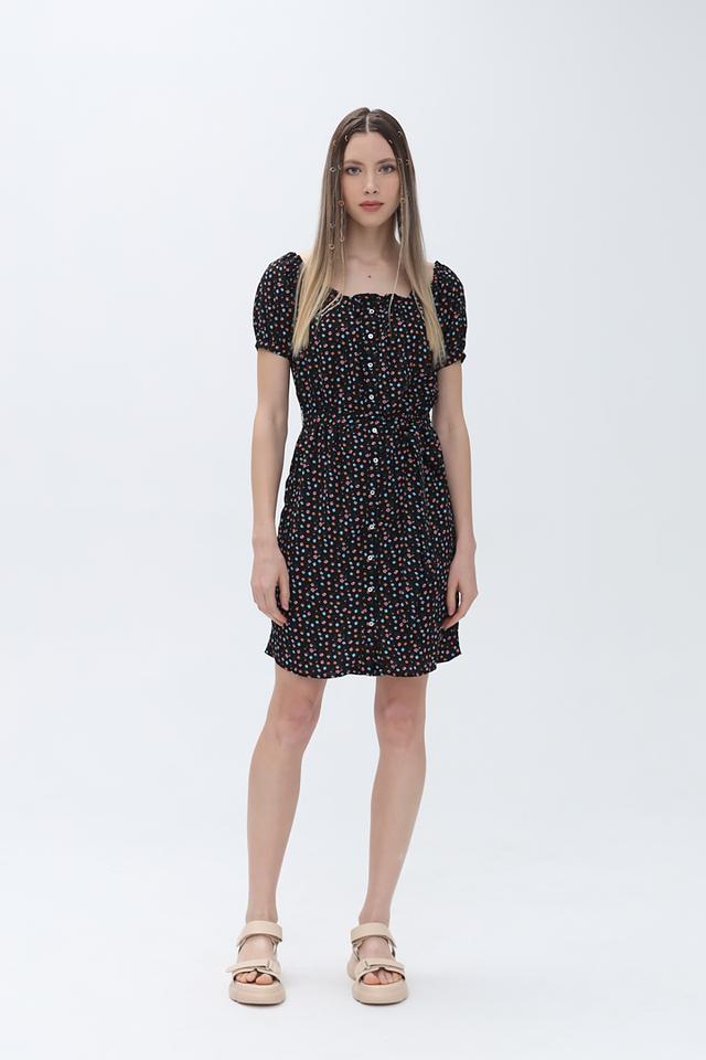 Модель имеет прямой крой, короткие рукава-фонарики и квадратный вырез горловины. Талия подчеркнута эластичной резинкой и дополнительным поясом, что позволяет регулировать посадку и создавать более женственный силуэт. Платье выполнено из 100% полиэстера, что обеспечивает комфорт в носке и простоту ухода.