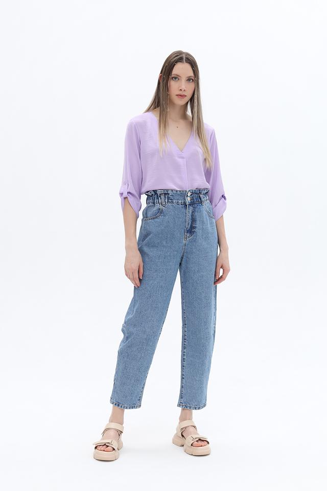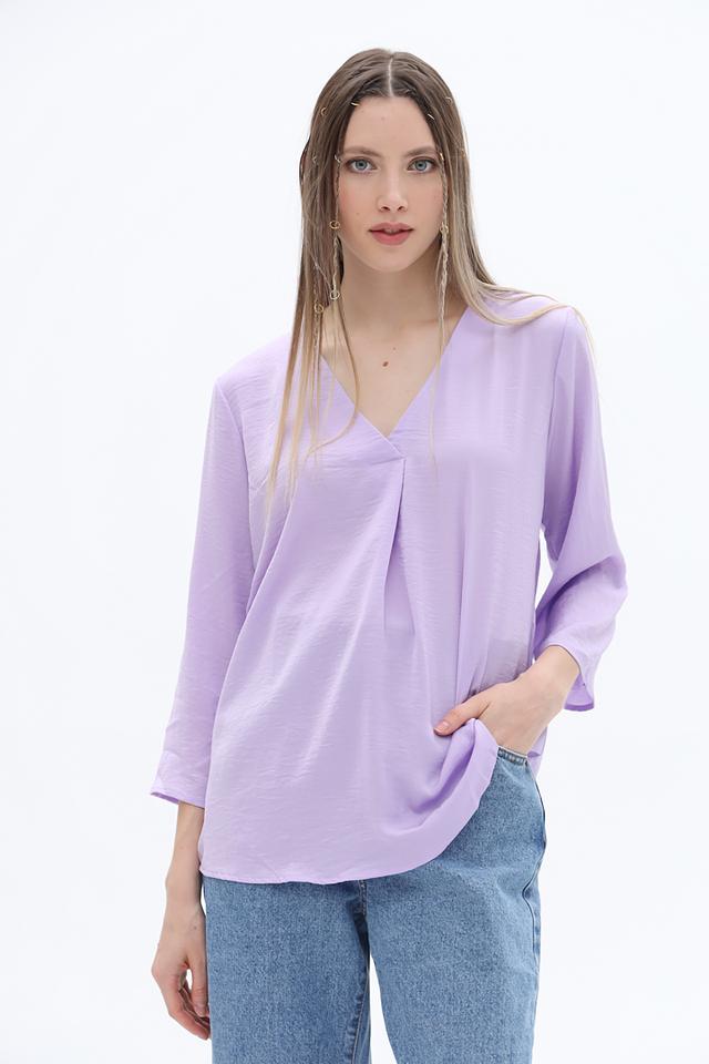 Блуза имеет лавандовый цвет, который придает образу нежность и женственность. V-образный вырез подчеркивает линию шеи, а рукава длиной 3/4 с аккуратными манжетами добавляют изысканности.