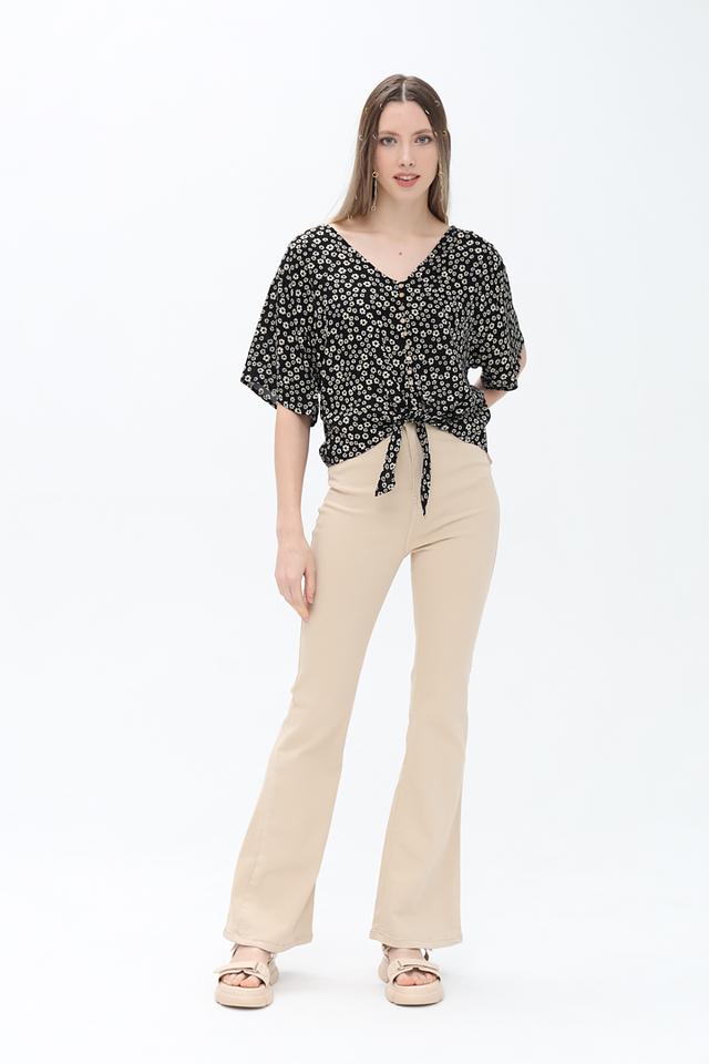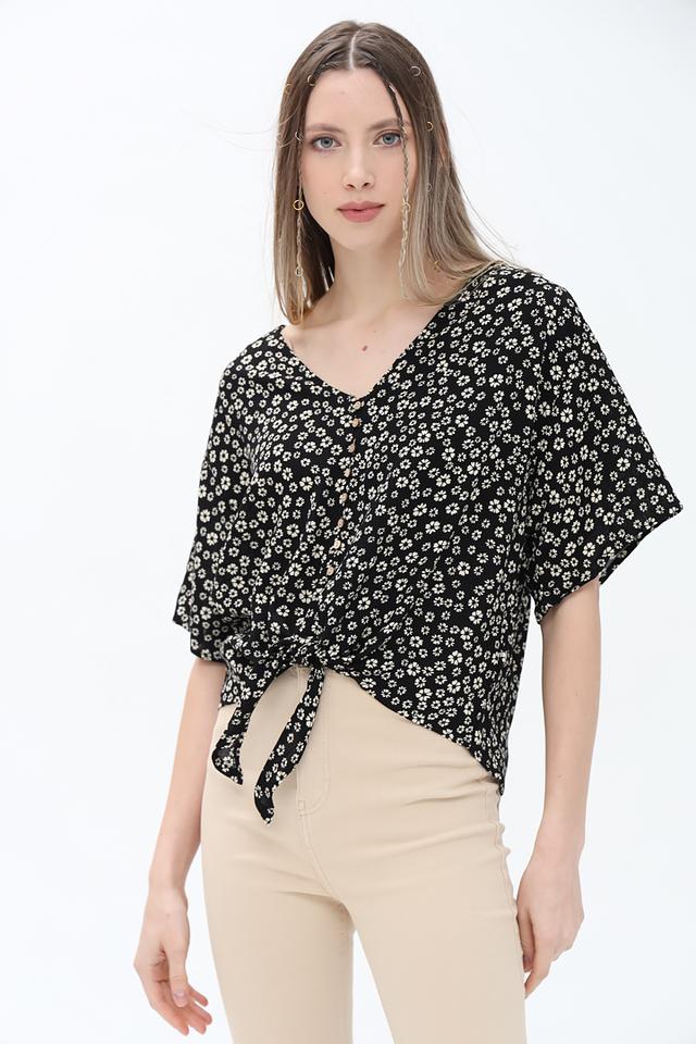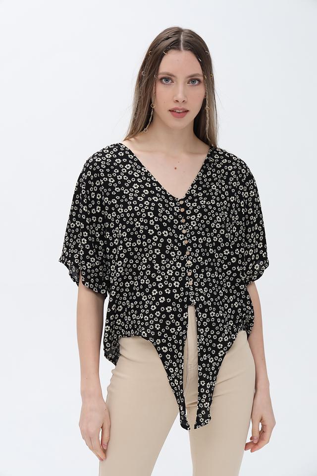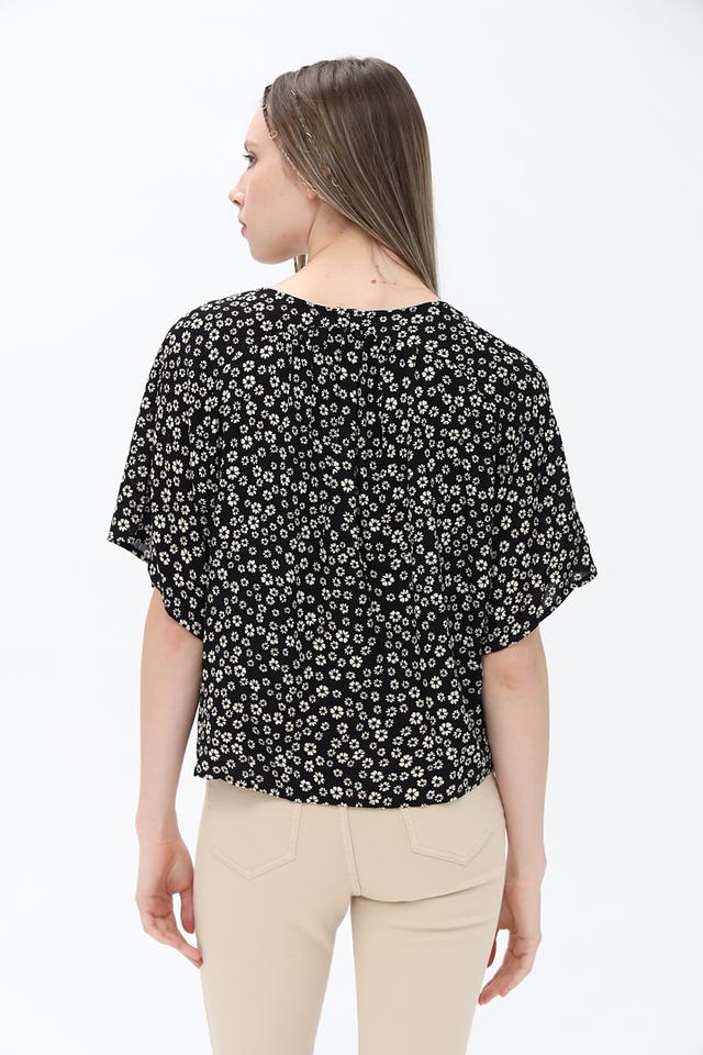 Блуза имеет классический V-образный вырез и короткие рукава, что делает её идеальным выбором для тёплой погоды. Чёрный цвет с мелким цветочным принтом придаёт образу женственность и лёгкость.