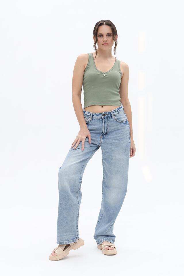 Топ имеет классический крой на тонких бретелях и V-образный вырез, который визуально удлиняет шею. Декоративные пуговицы добавляют изюминку и делают модель более интересной.