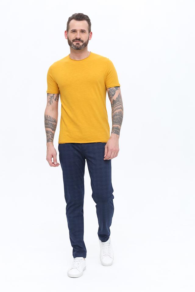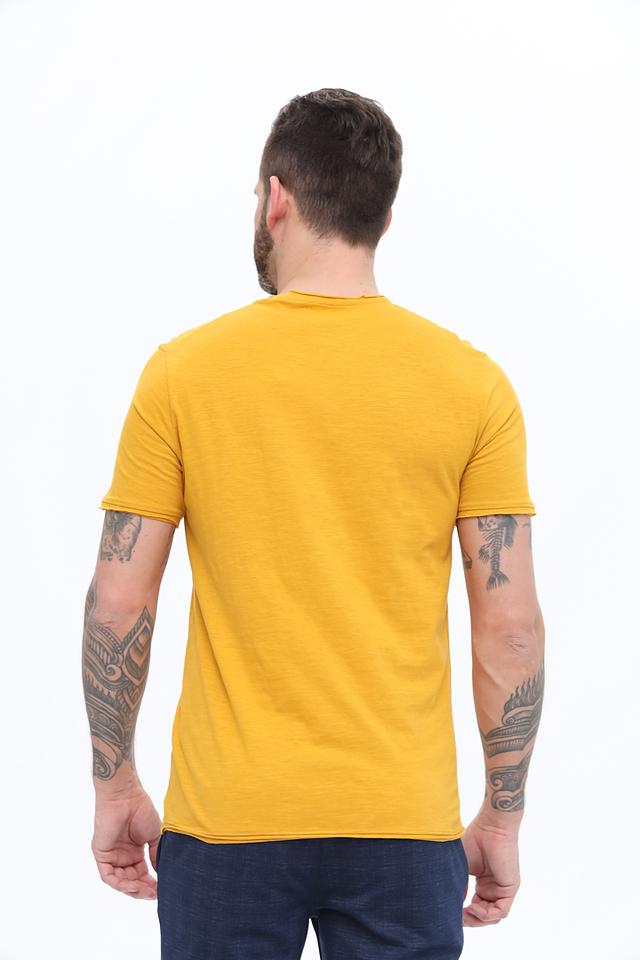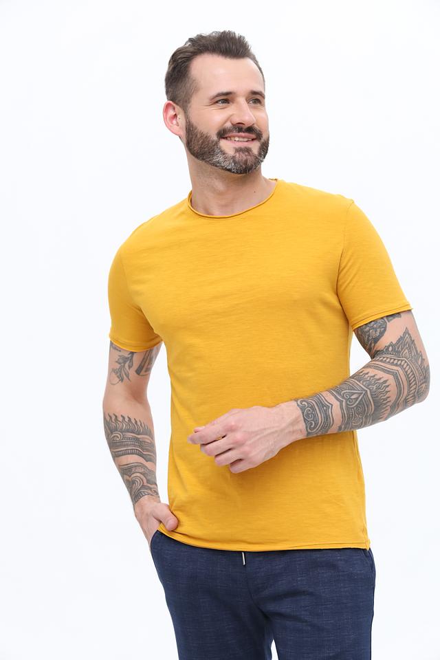 Цвет футболки – горчичный, что делает ее универсальным элементом гардероба, легко сочетающимся с различными стилями одежды. Округлый вырез горловины и короткие рукава делают эту футболку идеальным выбором для теплой погоды.