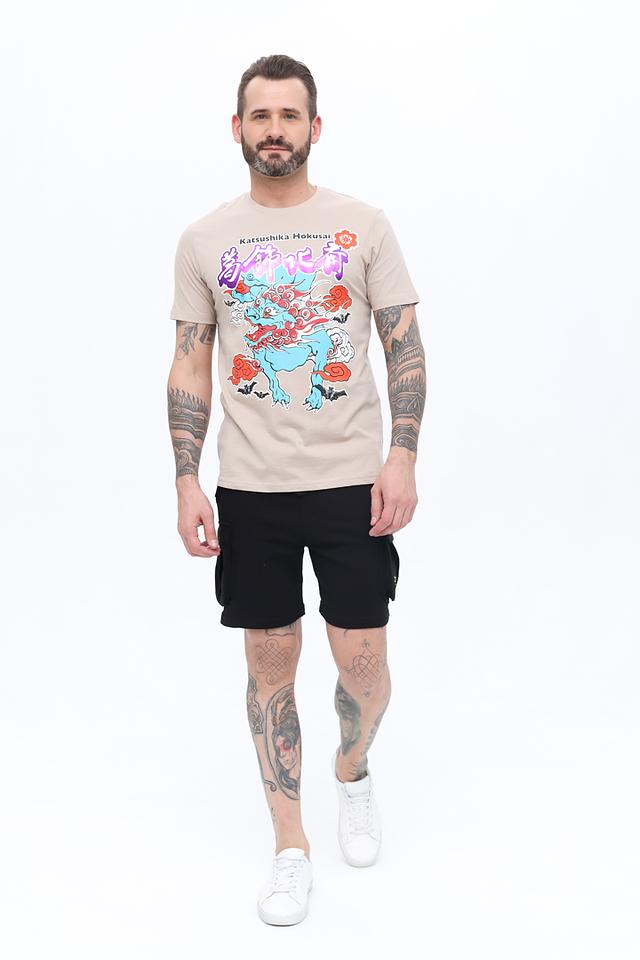 Основной цвет футболки – бежевый, который прекрасно сочетается с ярким и детализированным принтом в стиле работ японского художника Katsushika Hokusai. Принт изображает волну с драконом, выполненный в насыщенных синих, красных и белых тонах.