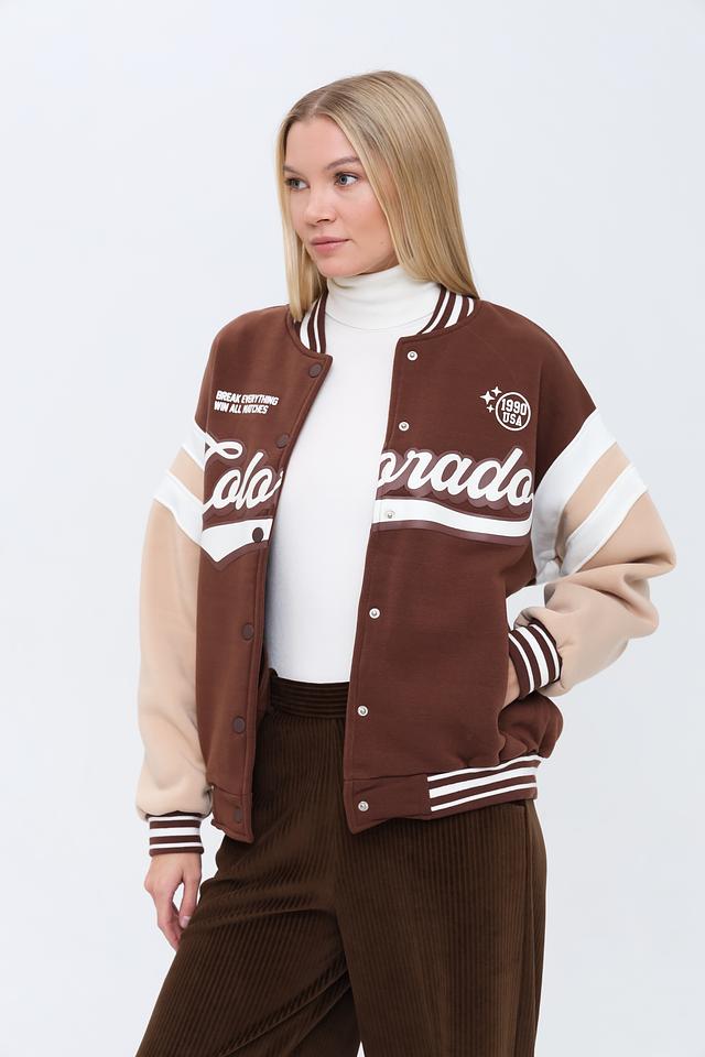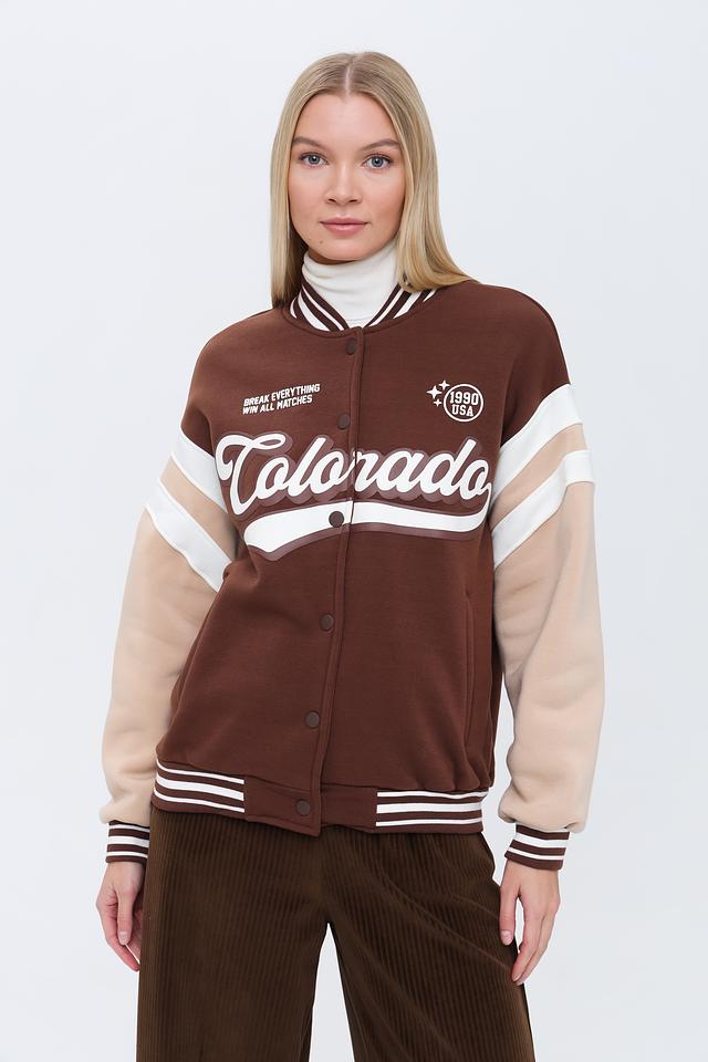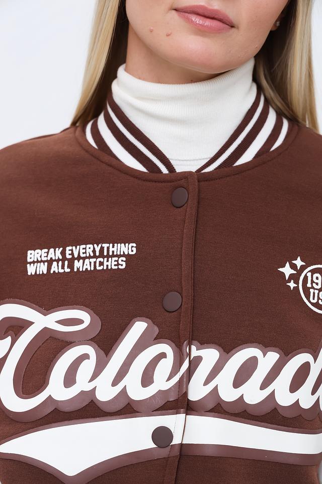 Модель имеет классический крой куртки-бомбера с застежкой на кнопки. Передняя часть украшена крупной надписью "Colorado" и логотипом бренда, выполненными в контрастных белых тонах. На груди также присутствует надпись "BREAK EVERYTHING WIN ALL MATCHES".