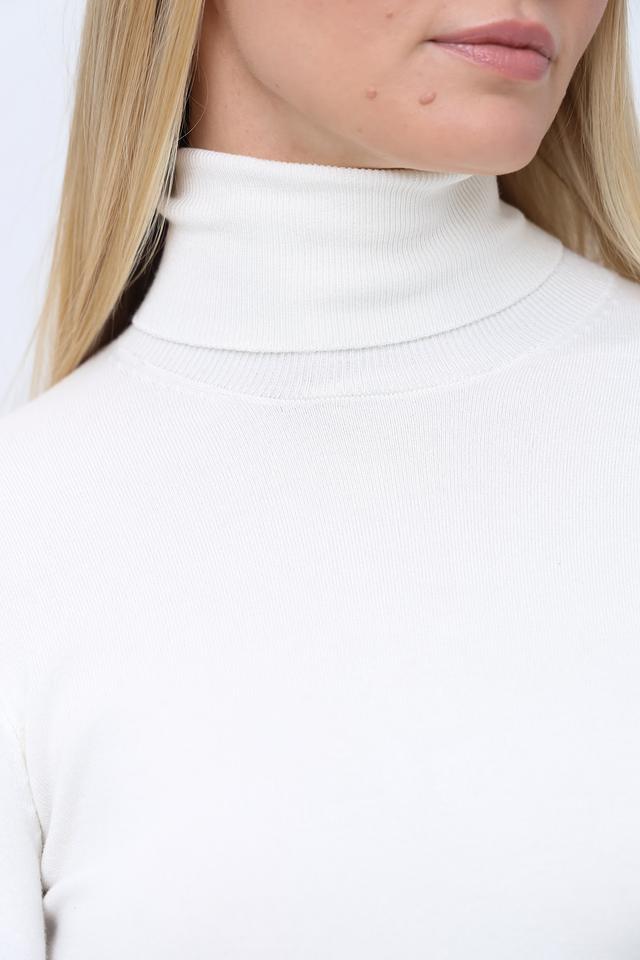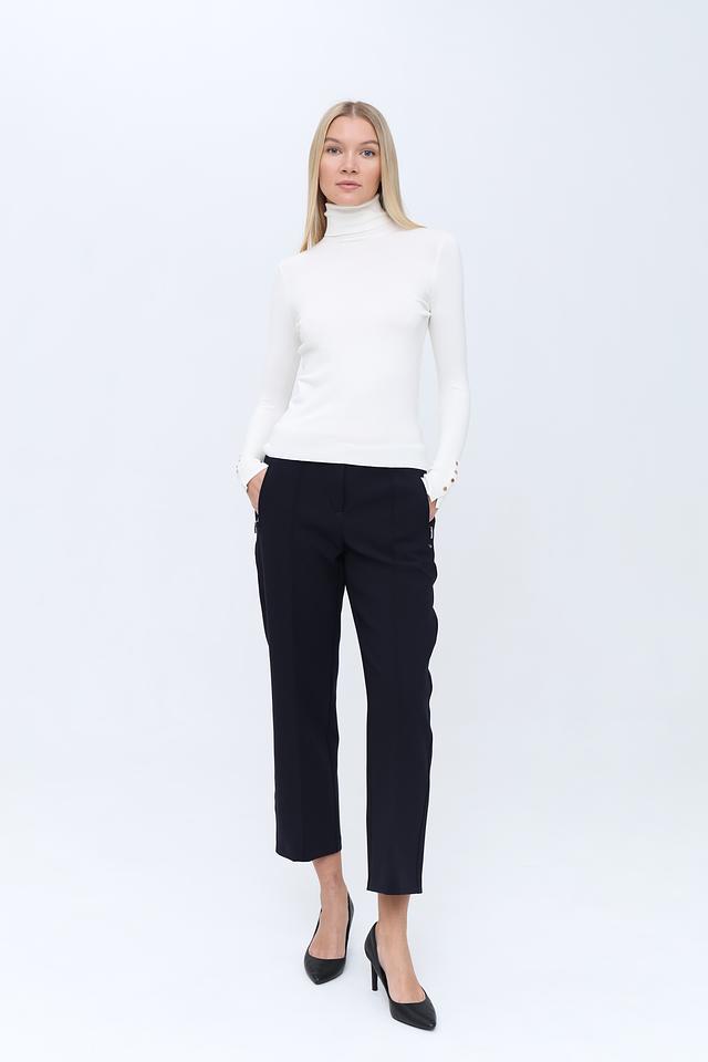 Модель имеет облегающий силуэт, подчеркивающий фигуру, и высокий воротник, который защищает от холода и придает образу изысканность. Рукава водолазки декорированы рядом аккуратных пуговиц, добавляющих ей оригинальности.