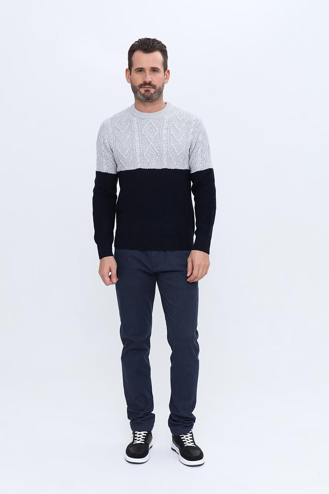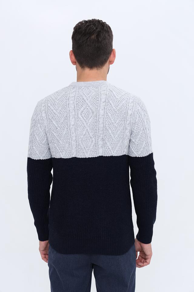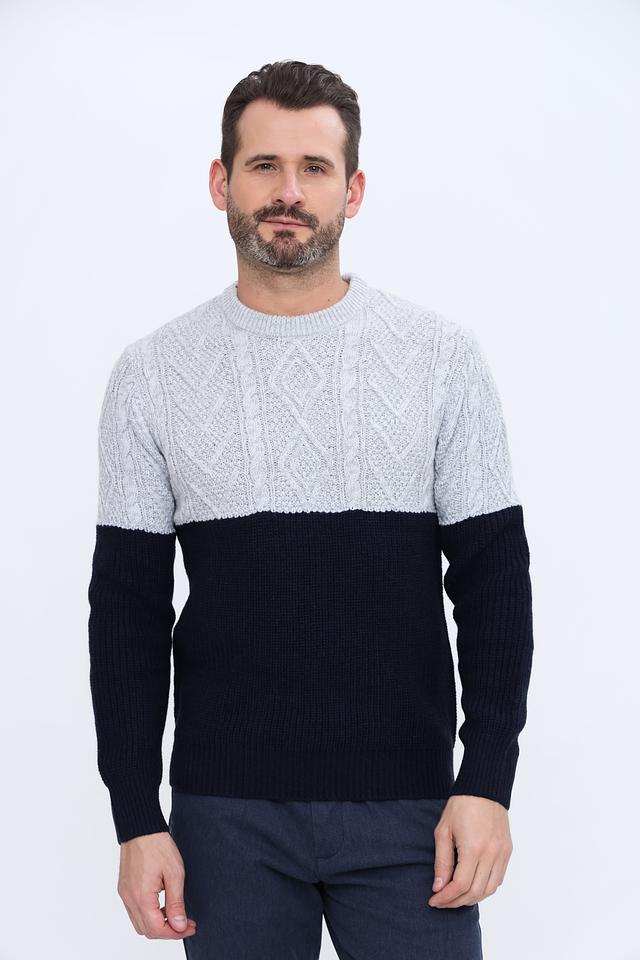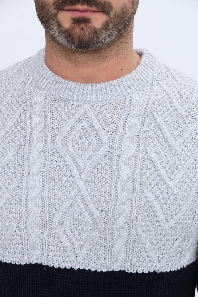 Мужской пуловер Alcott сочетает в себе серый и тёмно-синий цвета, выполнен из мягкого акрила с добавлением шерсти. Модель с узором "косы" и классическим круглым вырезом. Состав: акрил 90%, шерсть 10%