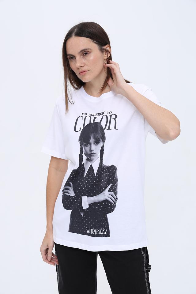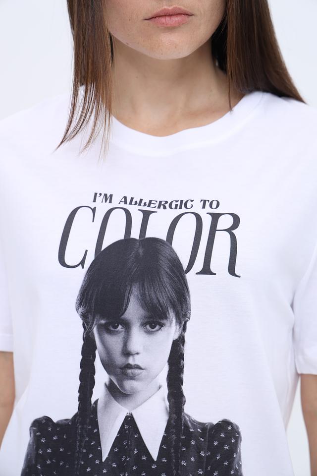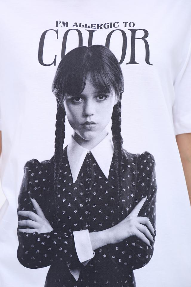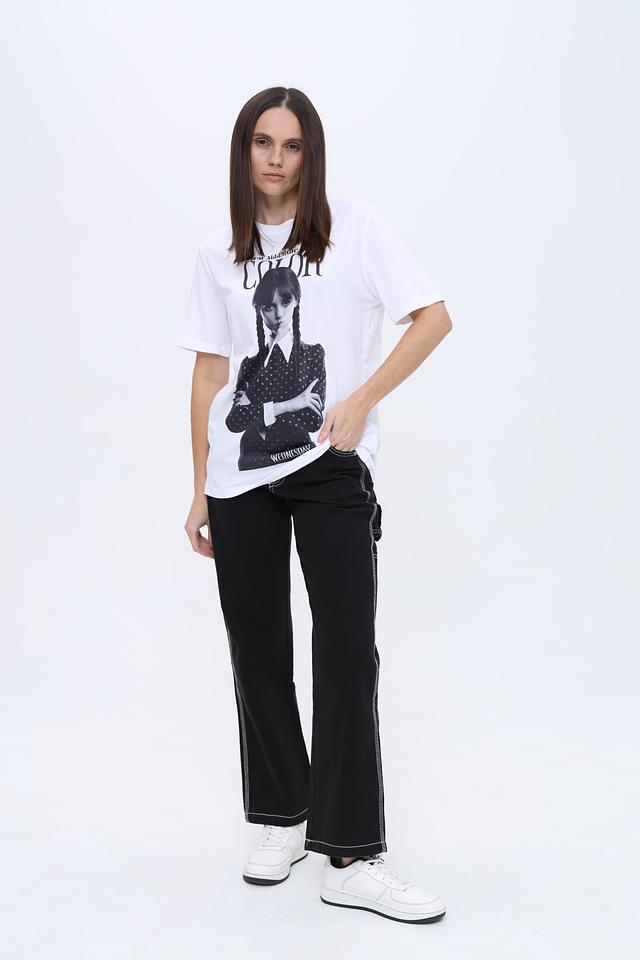 Основной цвет футболки – белый, что делает ее универсальной и легко сочетаемой с другими элементами гардероба. Главная особенность – крупный, детализированный принт с изображением Wednesday Addams, выполненный в черно-белой гамме.