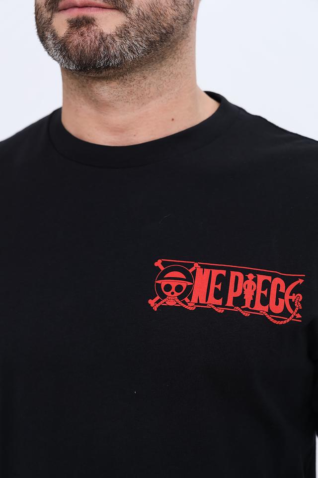 Чёрная мужская футболка Alcott с ярким принтом One Piece. Изготовлена из 100% хлопка, обеспечивая комфорт и воздухопроницаемость. Стильный дизайн с изображением персонажей популярного аниме. Состав: хлопок 100%