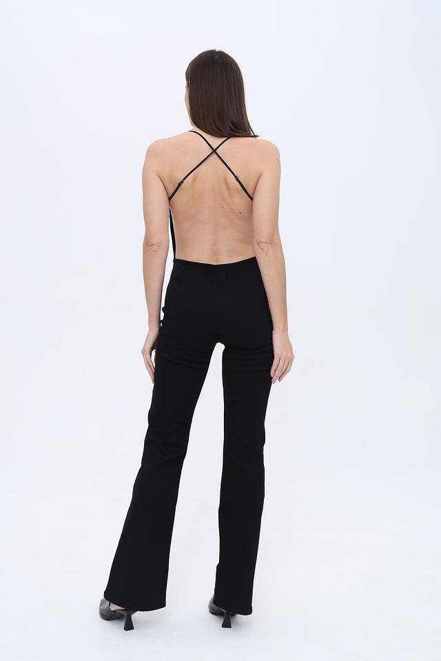 Комбинезон имеет приталенный силуэт, подчеркивающий фигуру, и широкие брючины, создающие элегантный образ. Тонкие бретельки и открытая спина придают модели легкость и женственность.