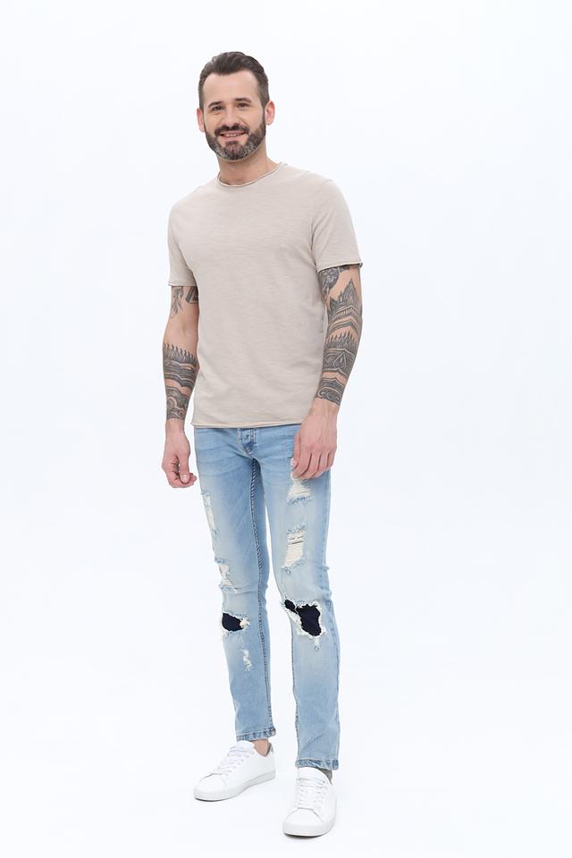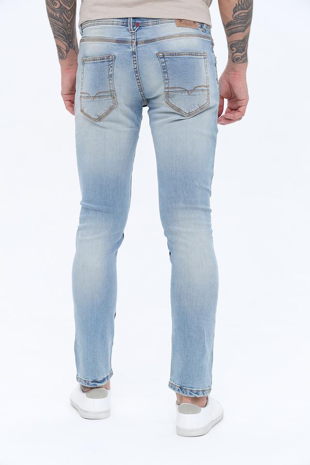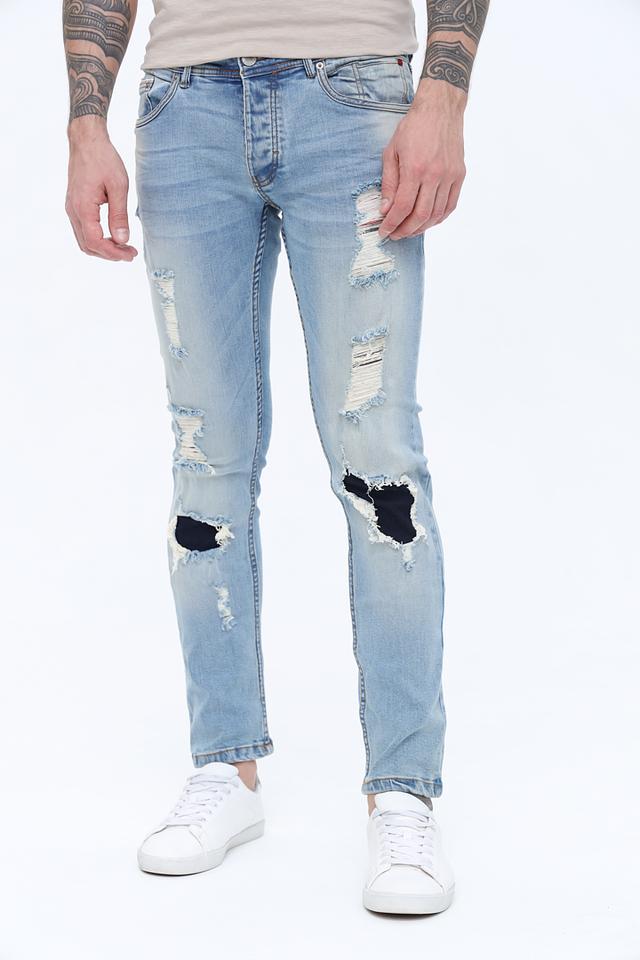 Мужские джинсы от бренда Alcott выполнены в светло-голубом цвете с эффектом состаренности. Модель отличается стильным дизайном с потертостями и рваными элементами, расположенными на бедрах и коленях.
