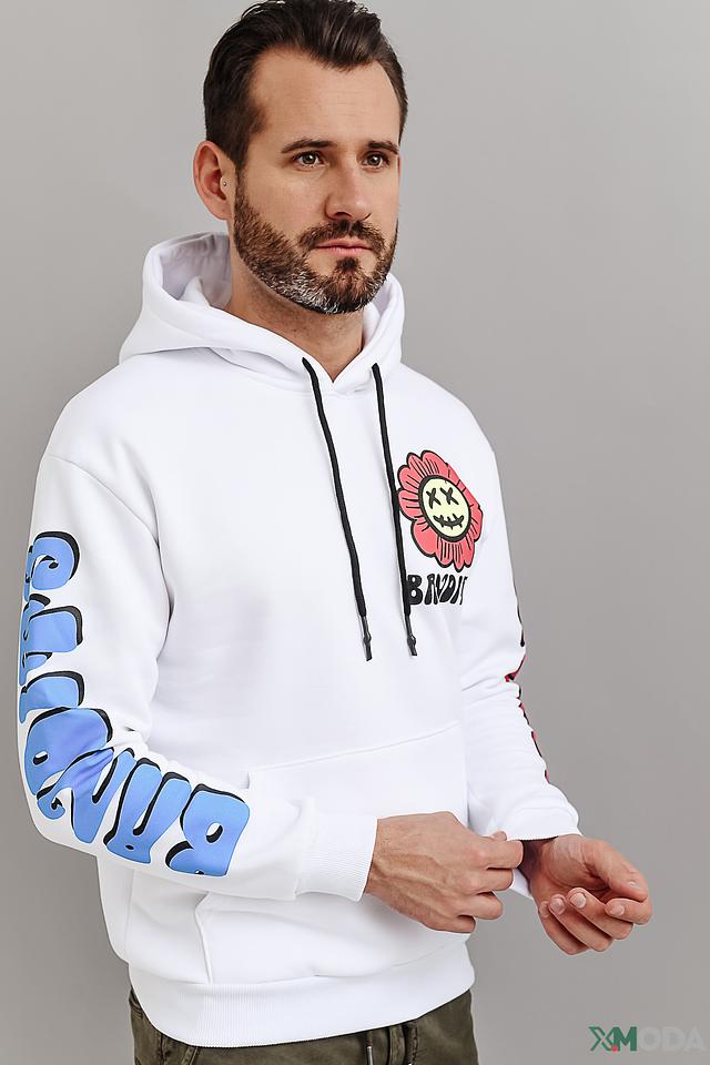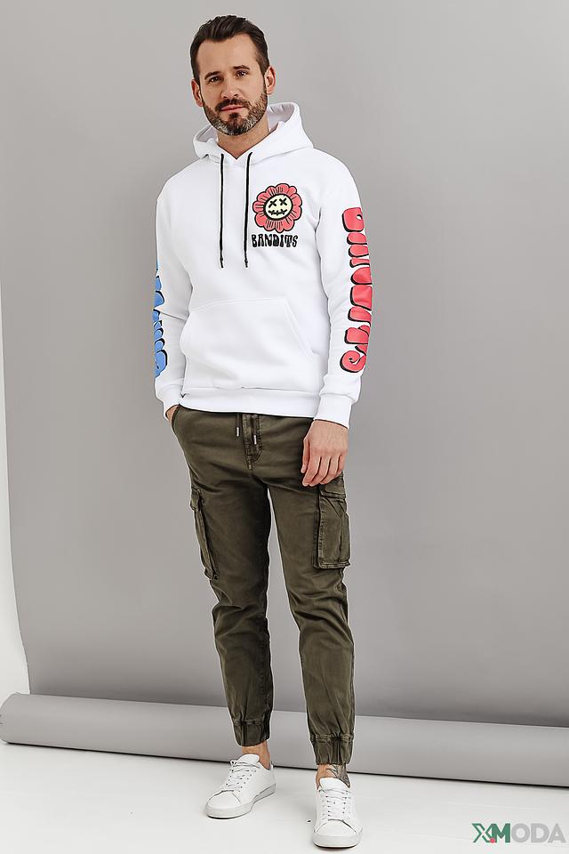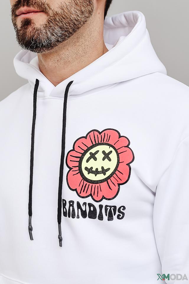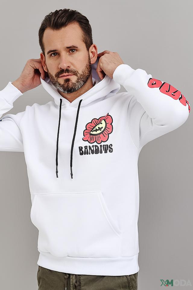 Белая мужская толстовка Alcott с ярким принтом "Bandits" на груди и рукавах. Модель выполнена из мягкого и комфортного хлопка с добавлением полиэстера, обеспечивающего износостойкость. Состав: хлопок 65%, полиэстер 35%
