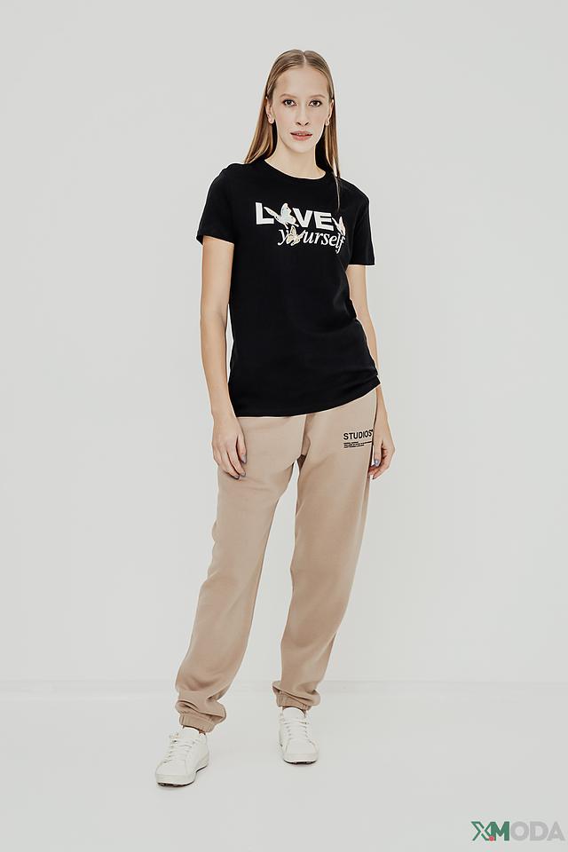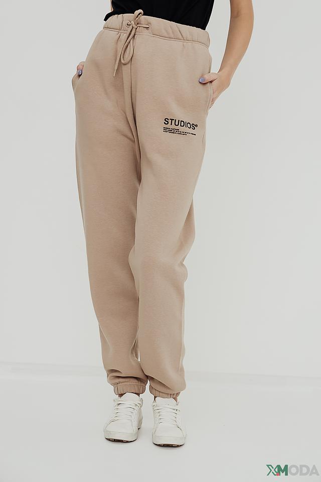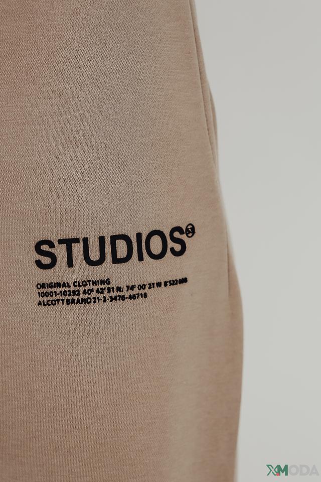 На брюках присутствует декоративная надпись "STUDIOS", выполненная в тон ткани. Боковые карманы добавляют функциональности. Манжеты внизу брюк обеспечивают плотное прилегание к ноге. Данная модель идеально подходит для занятий спортом, прогулок или повседневной носки.