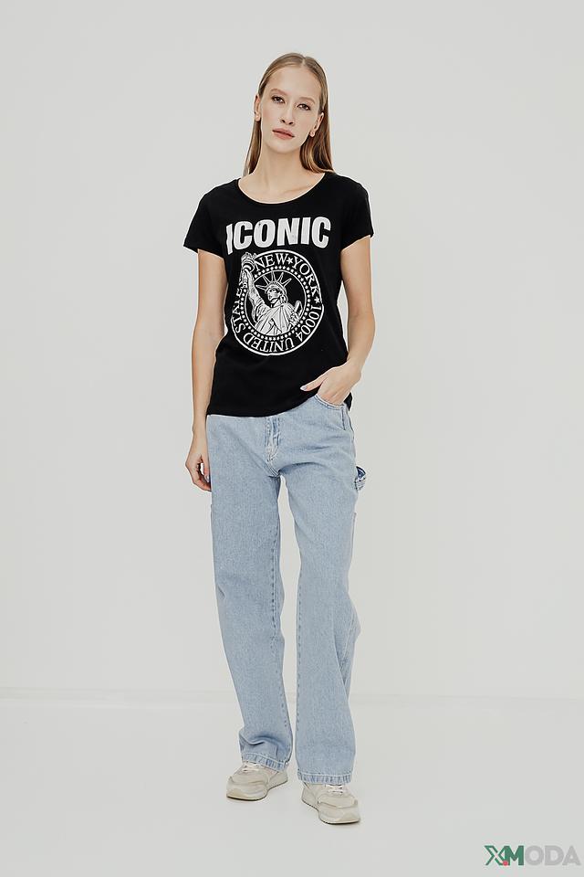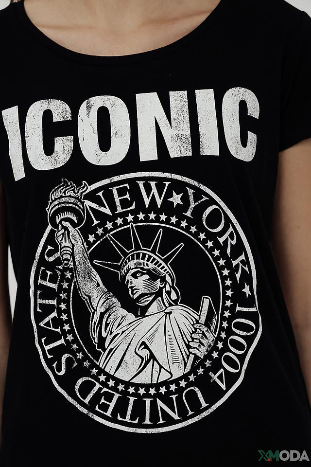 Эта футболка от Alcott станет отличным дополнением к вашему гардеробу. Она выполнена в классическом чёрном цвете и украшена эффектным принтом с изображением Статуи Свободы и надписью "Iconic".
