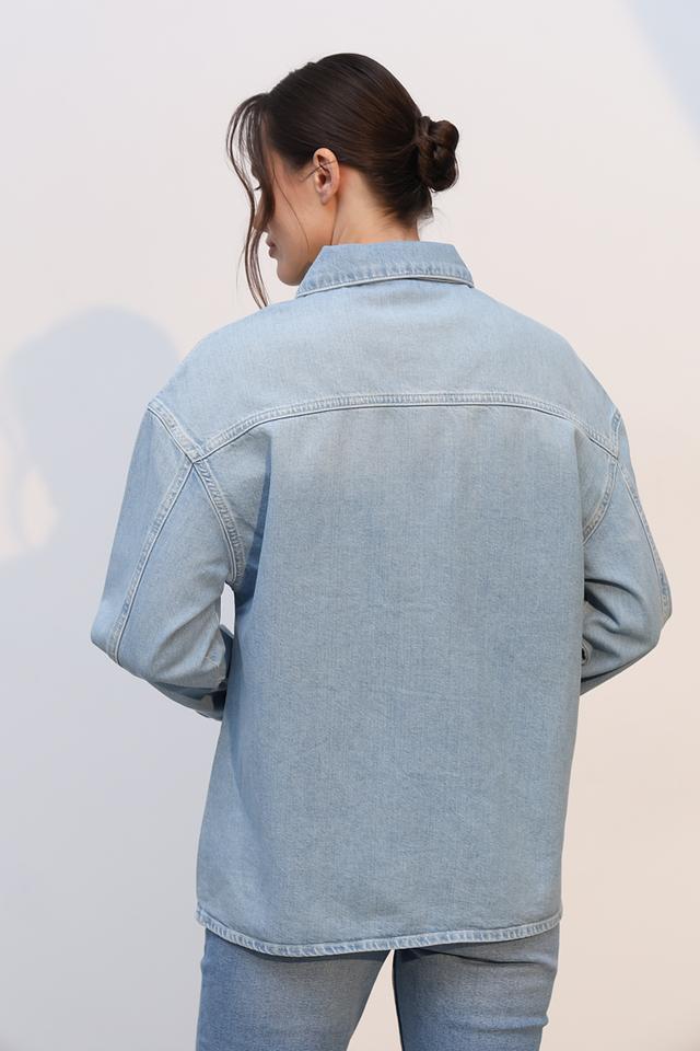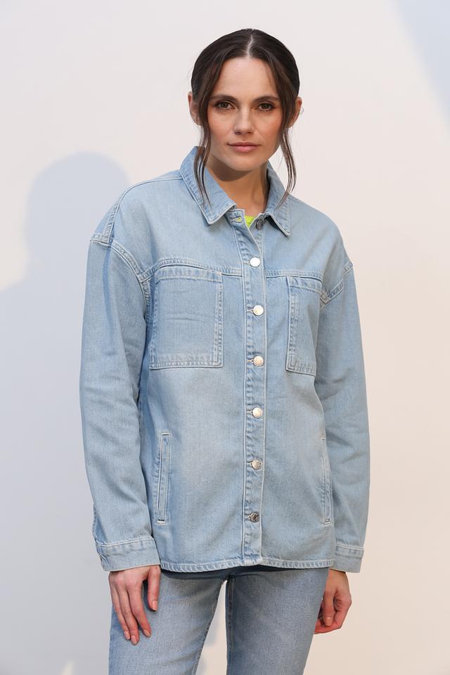 Жакет застегивается на пуговицы, имеет отложной воротник и два накладных кармана на груди. Длинные рукава с манжетами добавляют практичности. Изготовлен из 100% хлопка, что делает его приятным к телу и подходящим для повседневной носки.