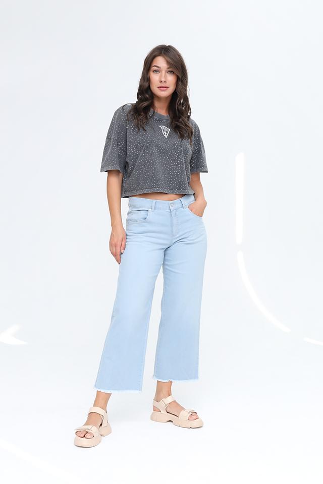 Представляем вашему вниманию стильные джинсы от бренда Angels. Эта модель выполнена в нежном голубом цвете и имеет крой кюлоты, который сейчас находится на пике популярности.