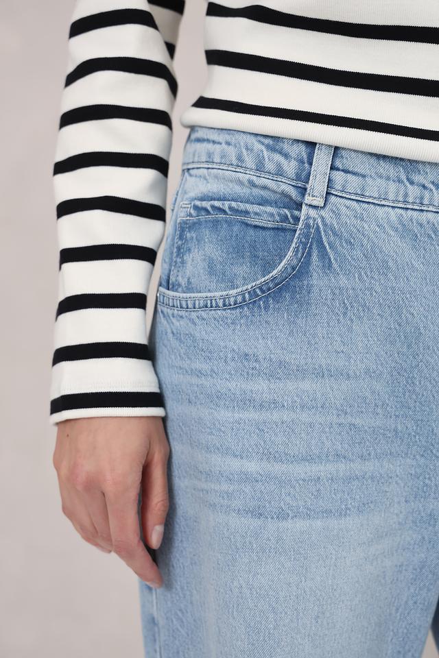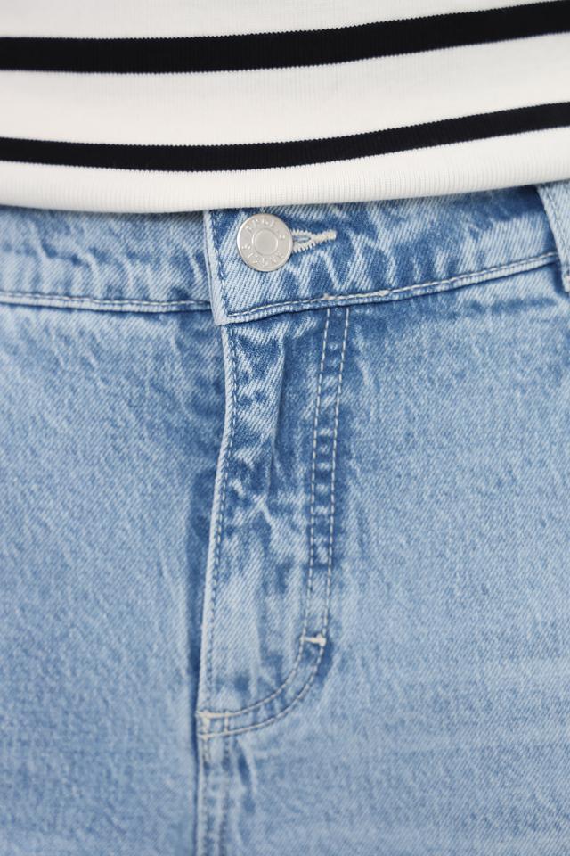 Джинсы имеют высокую посадку, что визуально удлиняет ноги и подчеркивает талию. Классическая застежка на пуговицу и молнию обеспечивает надежную фиксацию. На задних карманах расположен логотип бренда.