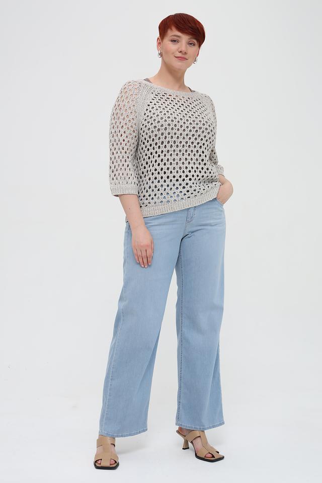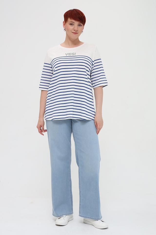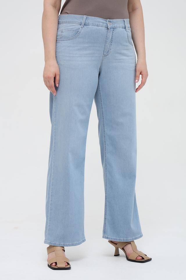 Джинсы имеют классический голубой цвет и клёш от бедра, что визуально вытягивает силуэт. Прямой крой и стандартная посадка делают их подходящими для разных типов фигуры.