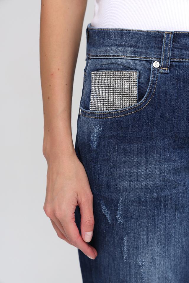 Особенности модели: высокая посадка, прямой крой, эффект потертости и рваные элементы. Декоративная отделка кармана стразами добавляет изюминку и привлекает внимание.