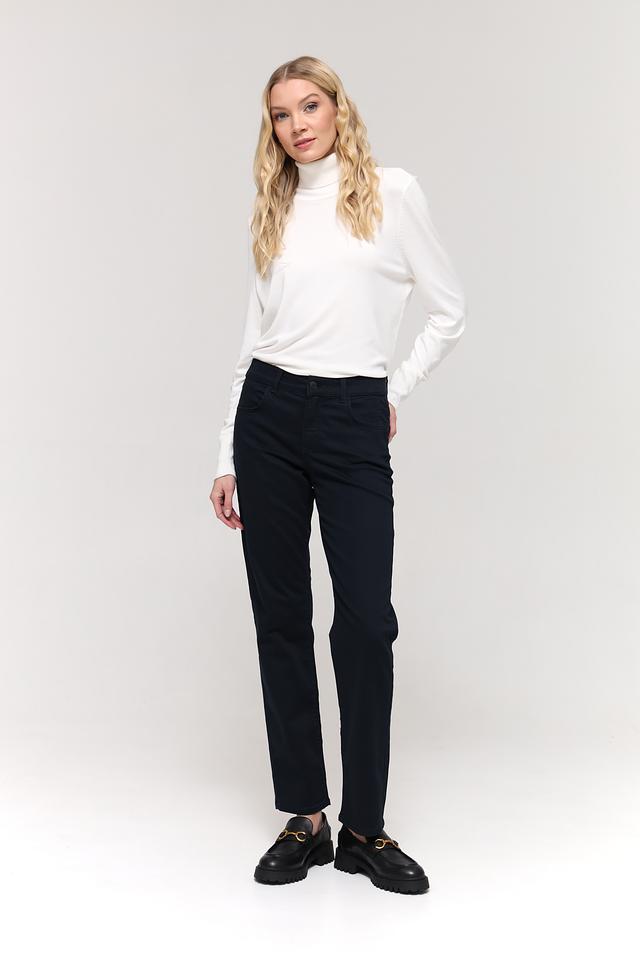 Брюки имеют прямой крой, который обеспечивает комфортную посадку по фигуре и не сковывает движений. Высокая посадка визуально удлиняет ноги и подчеркивает талию. Застежка на молнии и пуговице обеспечивает надежную фиксацию.