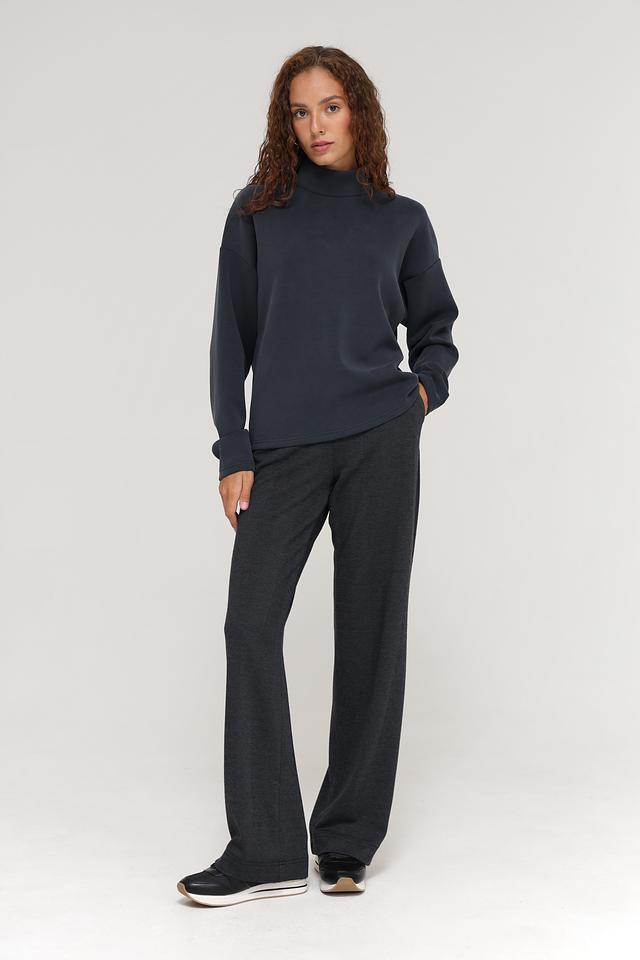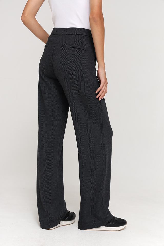 Брюки имеют прямой крой и клёш от колена, что придает им элегантный и современный вид. Эластичный пояс обеспечивает удобную посадку по фигуре, а также позволяет легко надевать и снимать брюки.