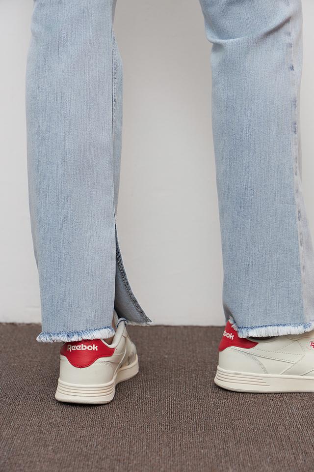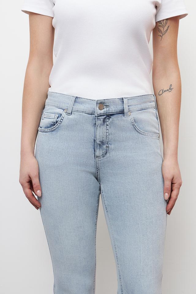 Джинсы имеют классический крой с высокой посадкой и расклешенными штанинами от колена, что визуально удлиняет ноги и создает женственный силуэт. Пять карманов – два спереди и два сзади – обеспечивают функциональность.