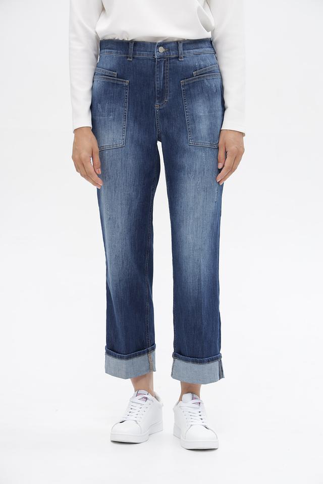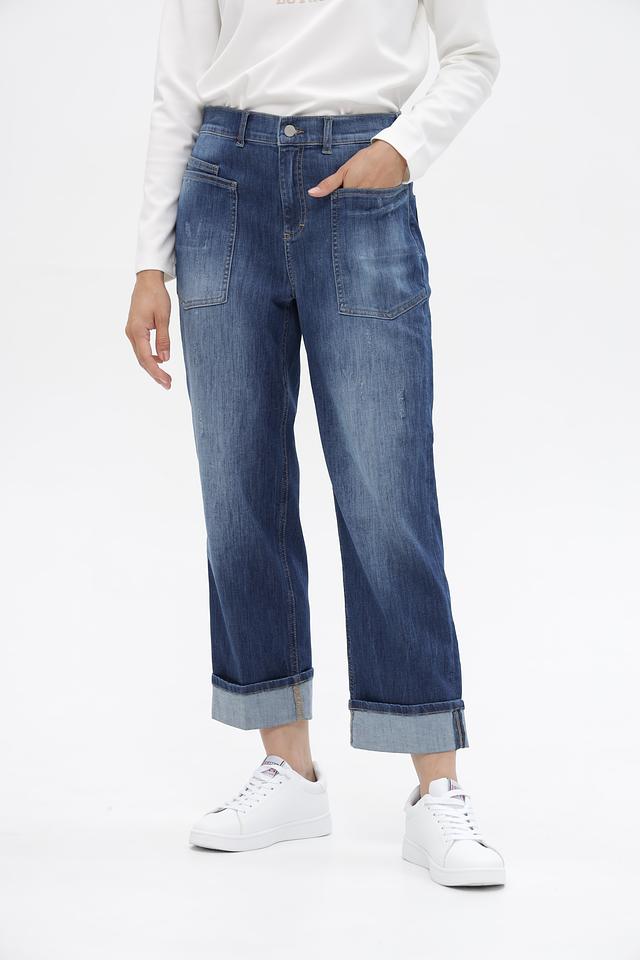 Джинсы имеют прямой крой и высокую посадку, подчеркивающую талию. Отличительной особенностью модели являются два больших накладных кармана на передней части брюк, добавляющие образу функциональности и оригинальности.