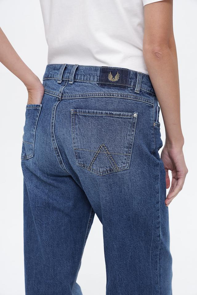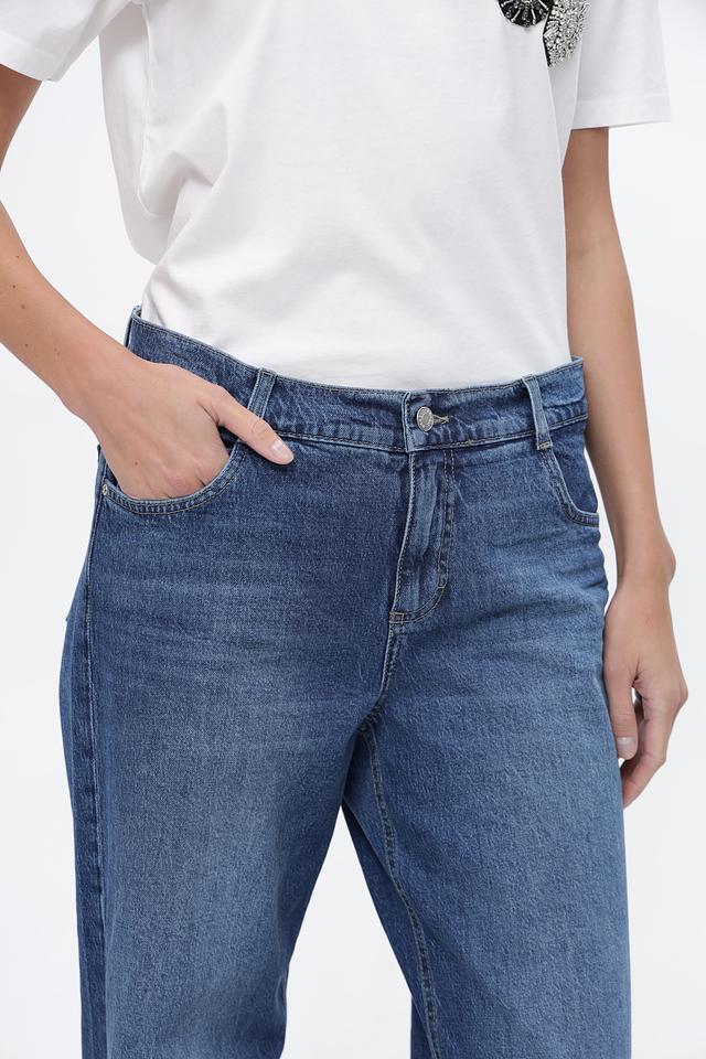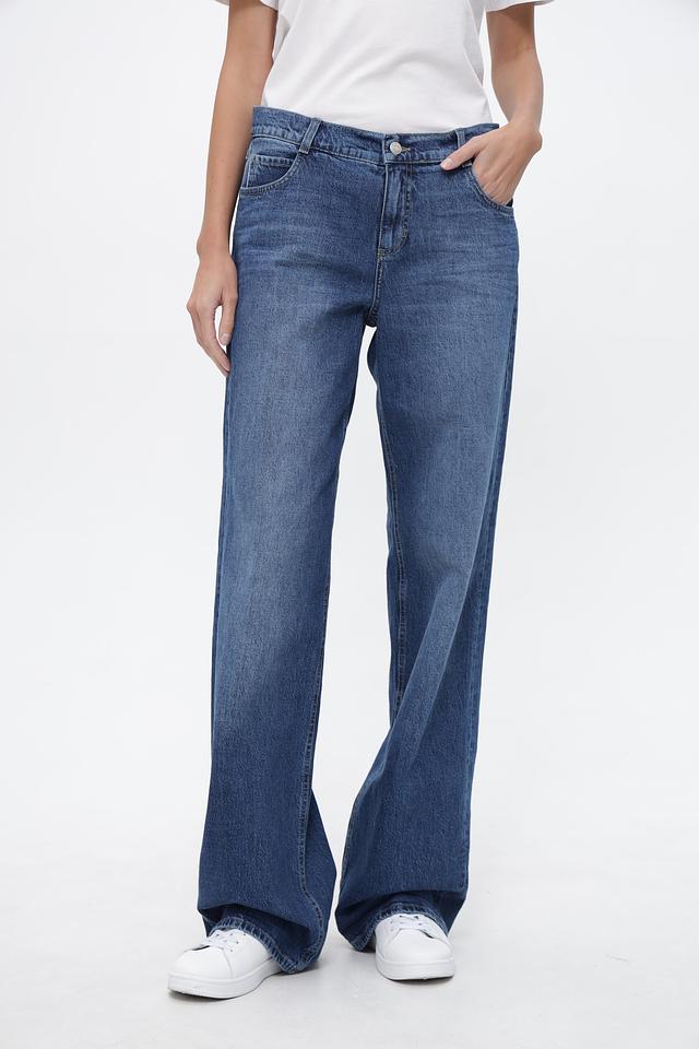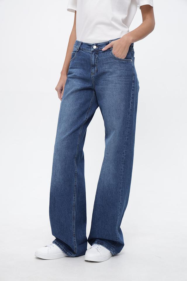 Джинсы имеют высокую посадку, подчеркивающую талию, и свободный крой, обеспечивающий свободу движений. Классический пятикарманный крой дополнен стильными потертостями, придающими образу непринужденность.