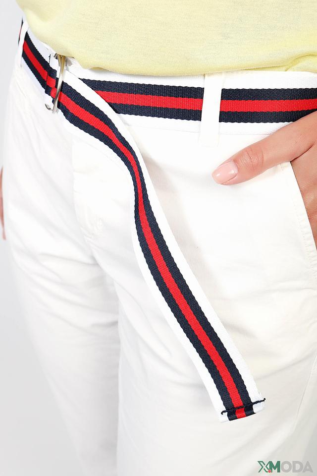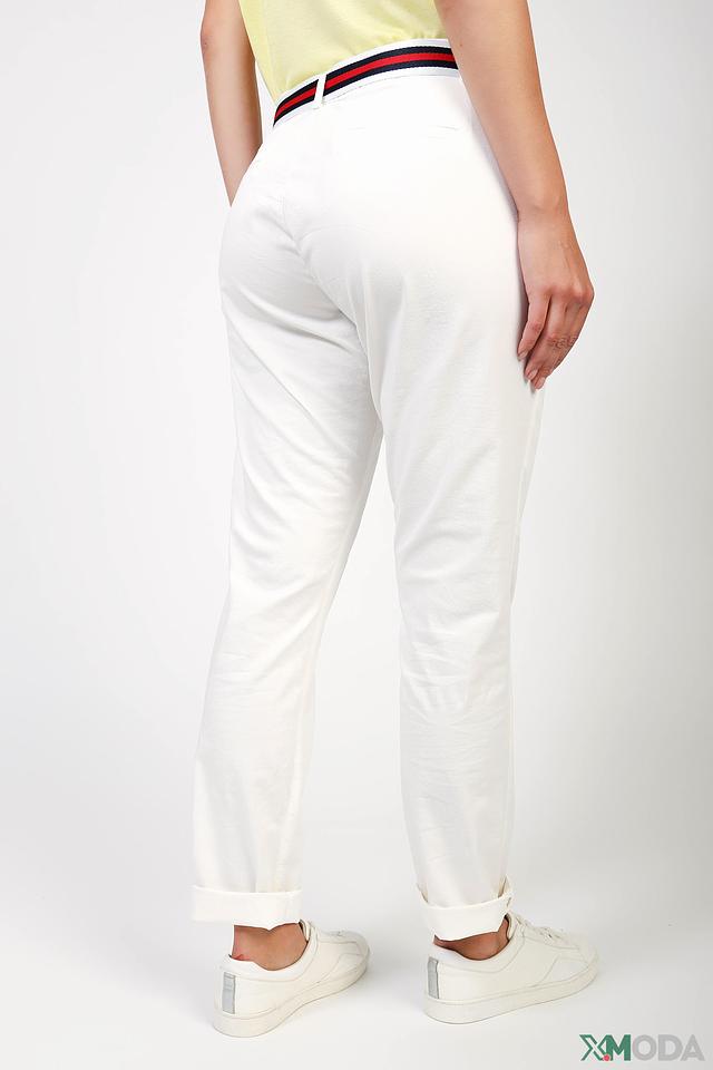 Брюки имеют классический крой с зауженными книзу штанинами и завышенной талией. Белый цвет делает их универсальными и легко сочетаемыми с различными элементами одежды. Особый акцент в дизайне — это декоративный пояс с яркими полосками, который придает образу динамичность и индивидуальность.
