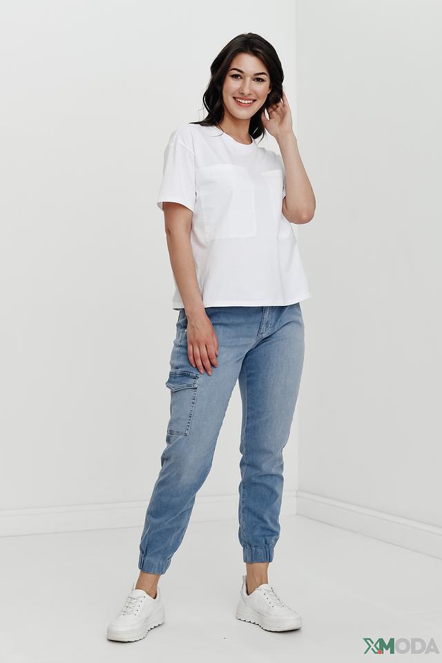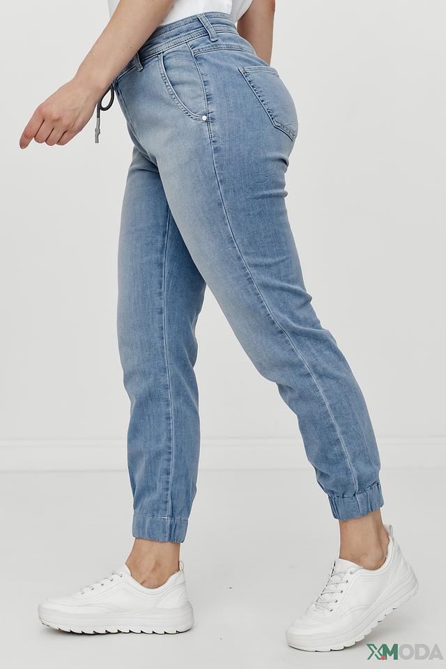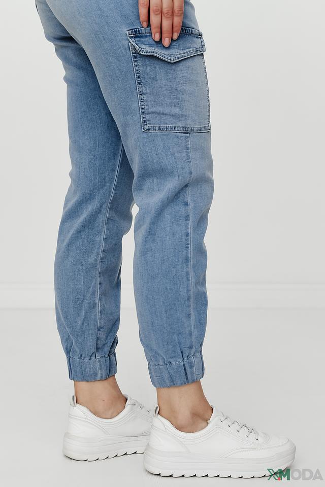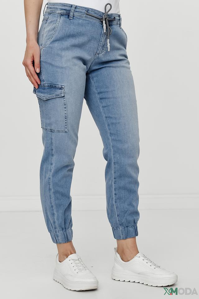 Джинсы имеют стандартную посадку, пояс на резинке с завязками, что обеспечивает комфорт при носке. На передней части брюк расположен накладной карман. Задние карманы классической формы.