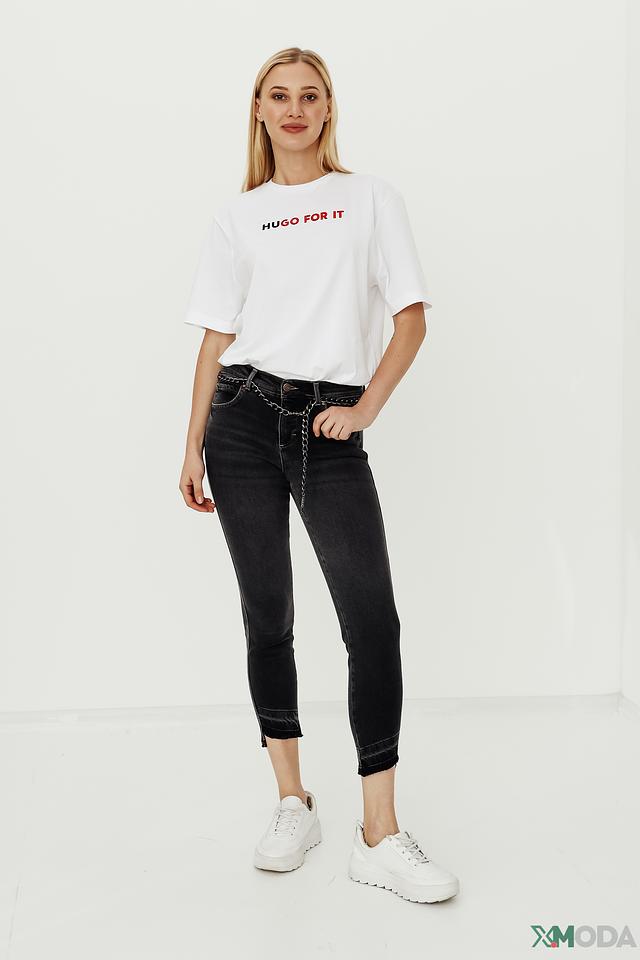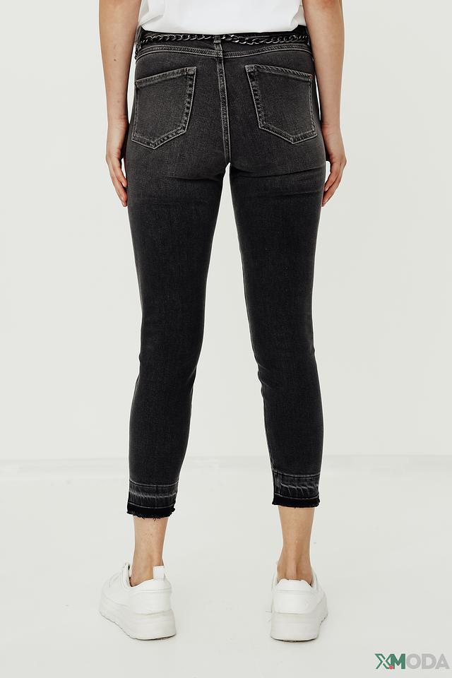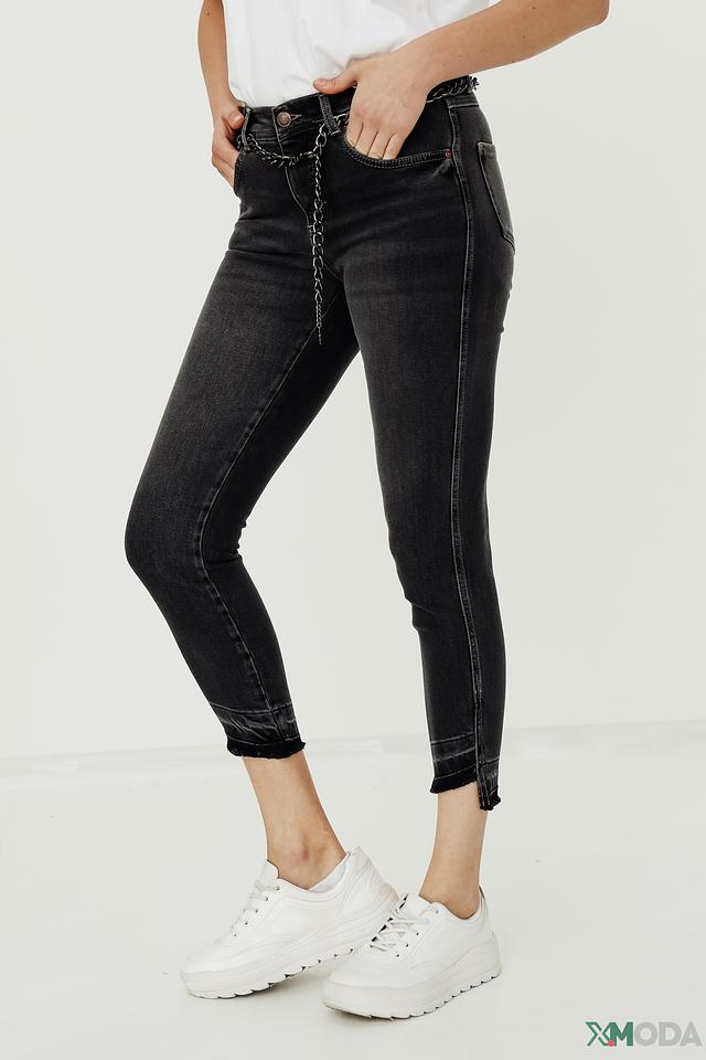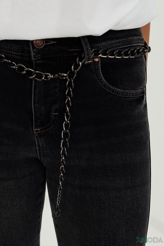 Джинсы имеют зауженный крой и укороченную длину, что делает их актуальными и стильными. Декоративная цепочка на поясе добавляет образу изюминку и привлекает внимание.