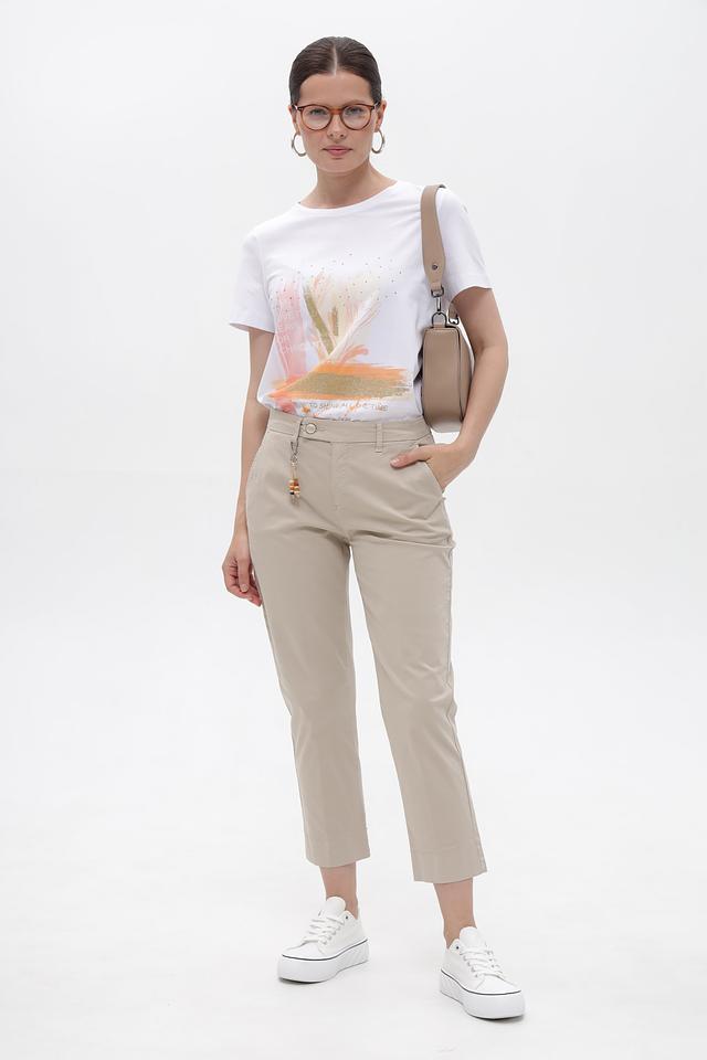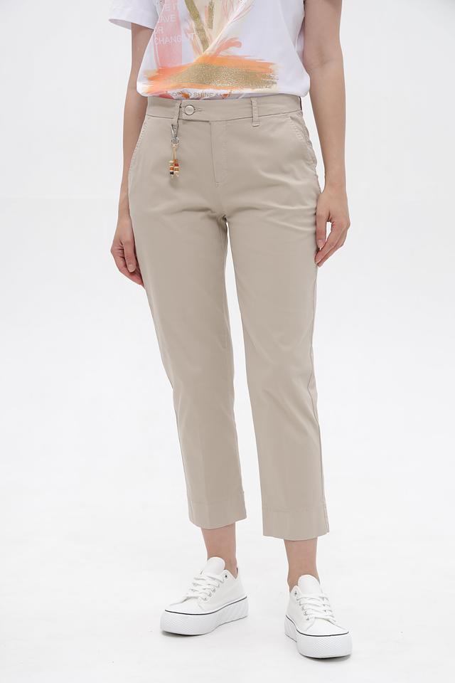 Брюки имеют прямой крой, который подчеркивает фигуру, не сковывая при этом движения. Бежевый цвет делает их универсальными и легко сочетаемыми с различными элементами гардероба. На поясе предусмотрены аккуратные петли для ремня, а также декоративный брелок с подвесками, добавляющий образу изюминку.