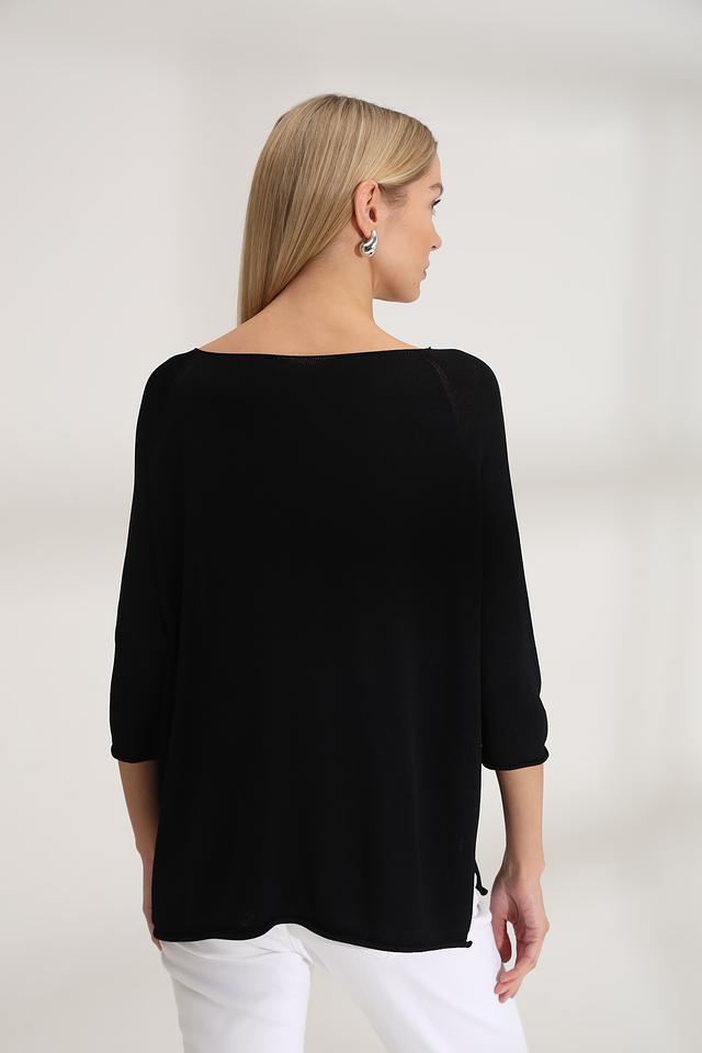 Модель имеет свободный крой, который обеспечивает комфорт в носке, а V-образный вырез горловины придаёт образу элегантность. Рукава ¾ делают этот пуловер универсальным для разных сезонов.
