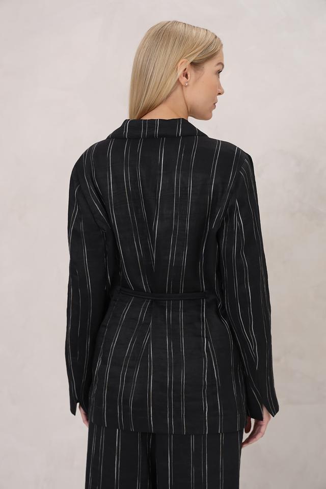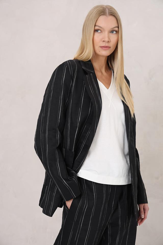 Этот жакет от Annette Gortz станет незаменимой частью вашего гардероба. Классический чёрный цвет с тонкими белыми полосками делает его универсальным и подходящим для различных случаев.