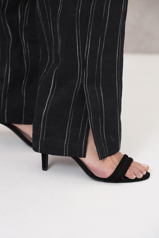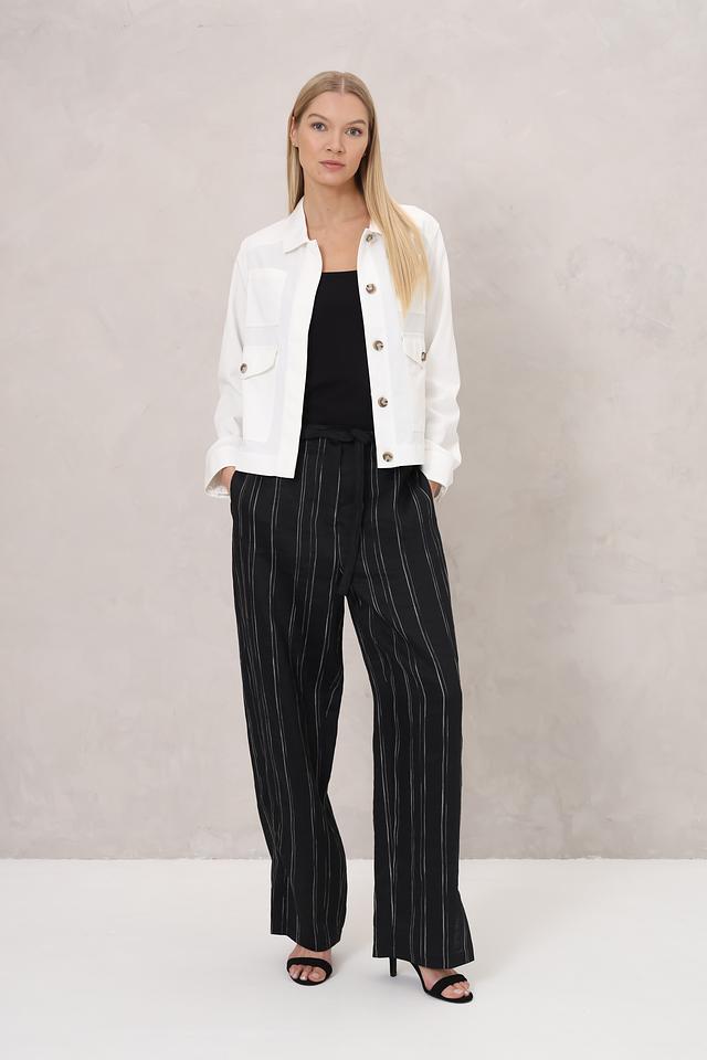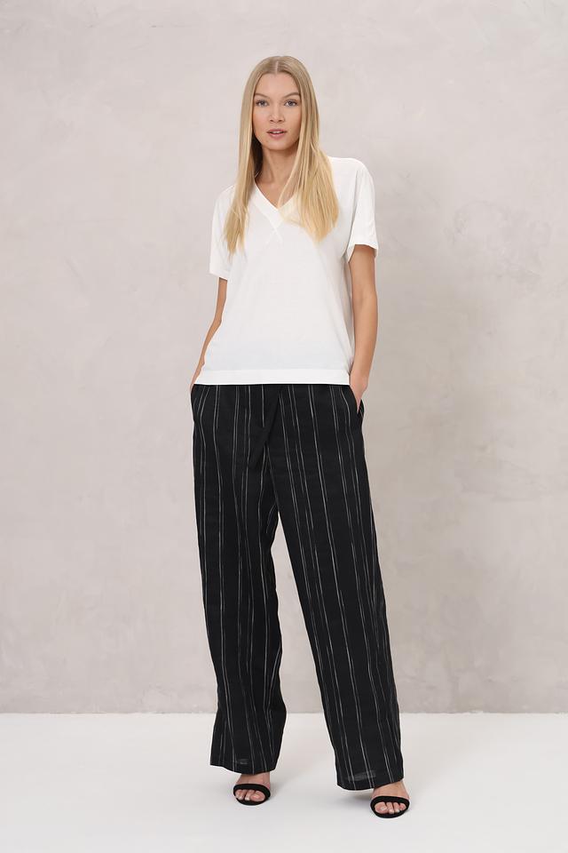 Материал – лен с добавлением полиэстера. Лен обеспечивает воздухопроницаемость и приятные тактильные ощущения, а полиэстер добавляет прочности и устойчивости к сминанию. Брюки имеют вертикальную полоску, которая визуально стройнит фигуру. Состав: лен 89%, полиэстер 11%.