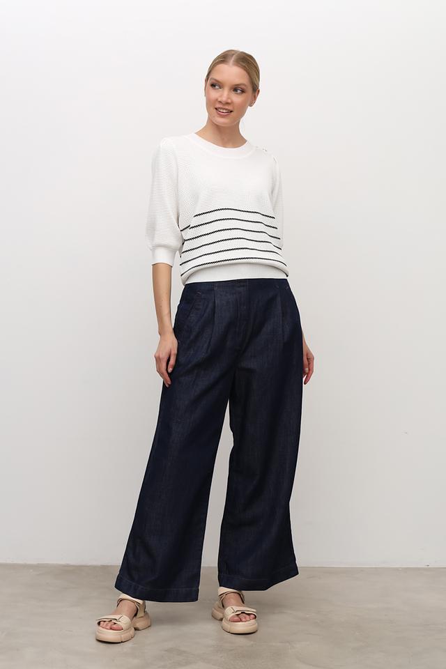 Модель имеет короткие рукава и округлый вырез горловины. Пуловер имеет слегка приталенный силуэт и небольшие декоративные пуговицы на плечах, добавляющие изысканности.