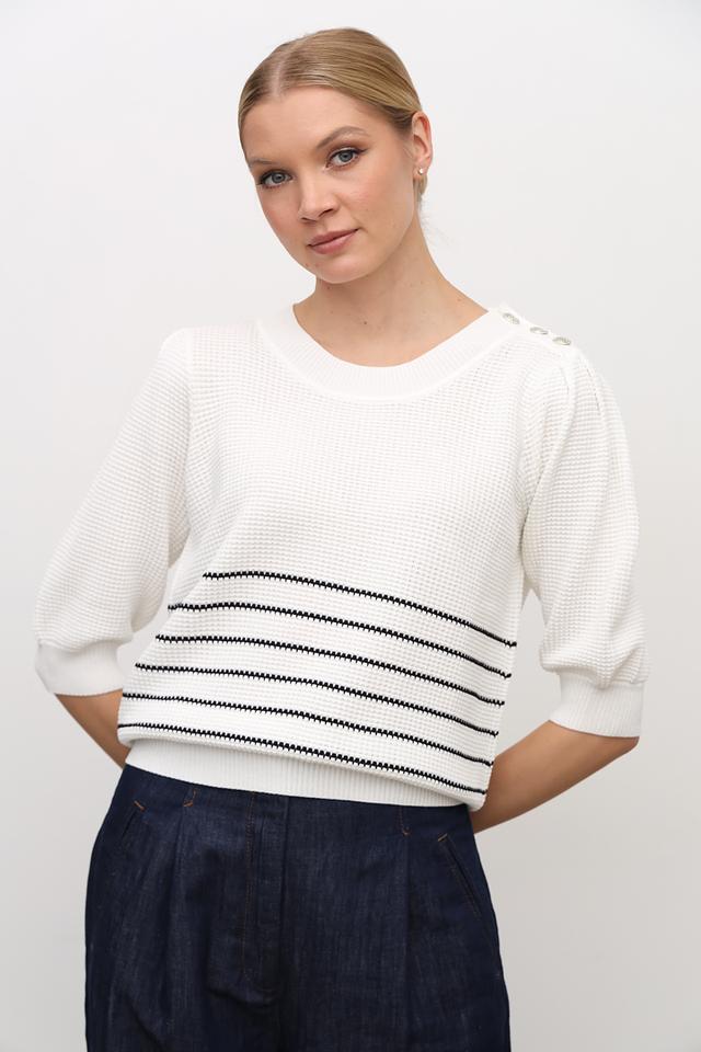 Этот пуловер от Apart станет отличным дополнением к вашему гардеробу. Он выполнен в белом цвете и украшен горизонтальными полосками в тонкую черную полоску, что придает ему свежий и современный вид.