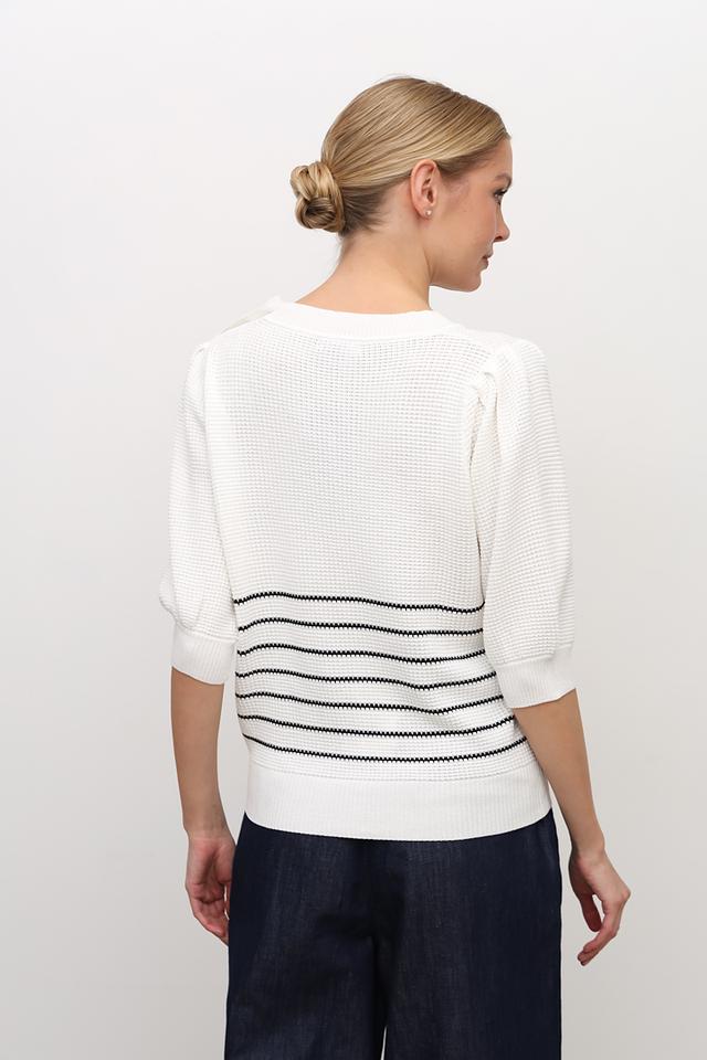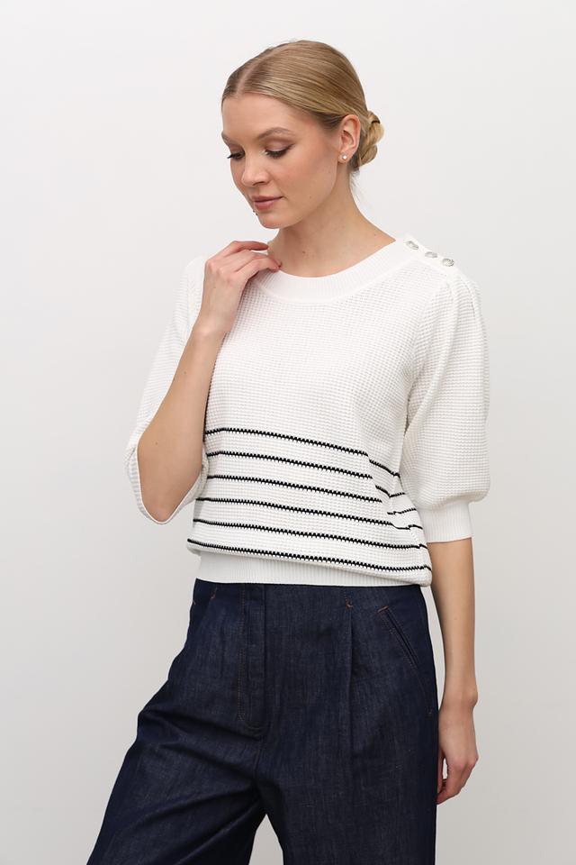 Белый пуловер Apart с короткими рукавами и полосками. Модель выполнена из мягкого сочетания полиэстера и вискозы, обеспечивая комфорт и удобство в носке. Стильный и универсальный выбор для создания повседневных образов. Состав: полиэстер 60%, вискоза 40%
