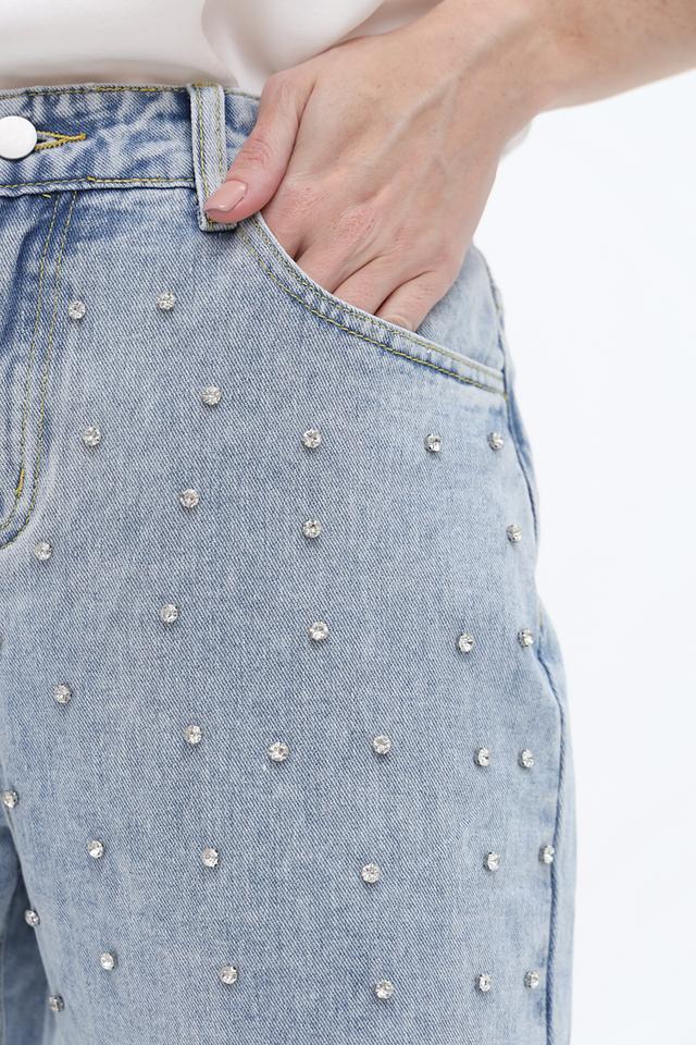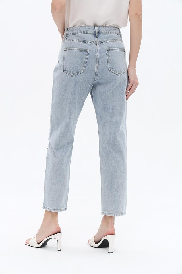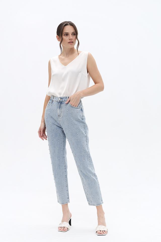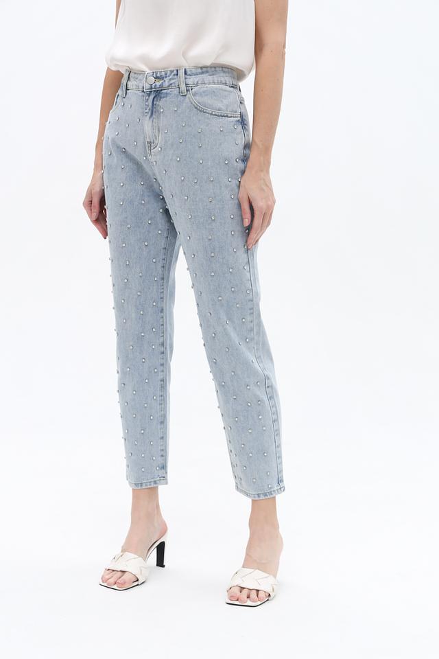 Джинсы имеют голубой цвет и украшены множеством декоративных жемчужин, которые придают им особый шарм и изысканность. Завышенная талия подчеркивает фигуру, а укороченный прямой крой делает их универсальными для создания различных образов.