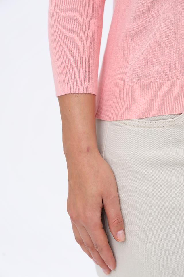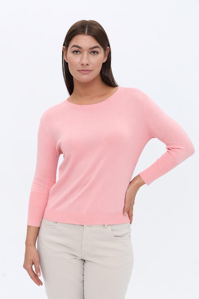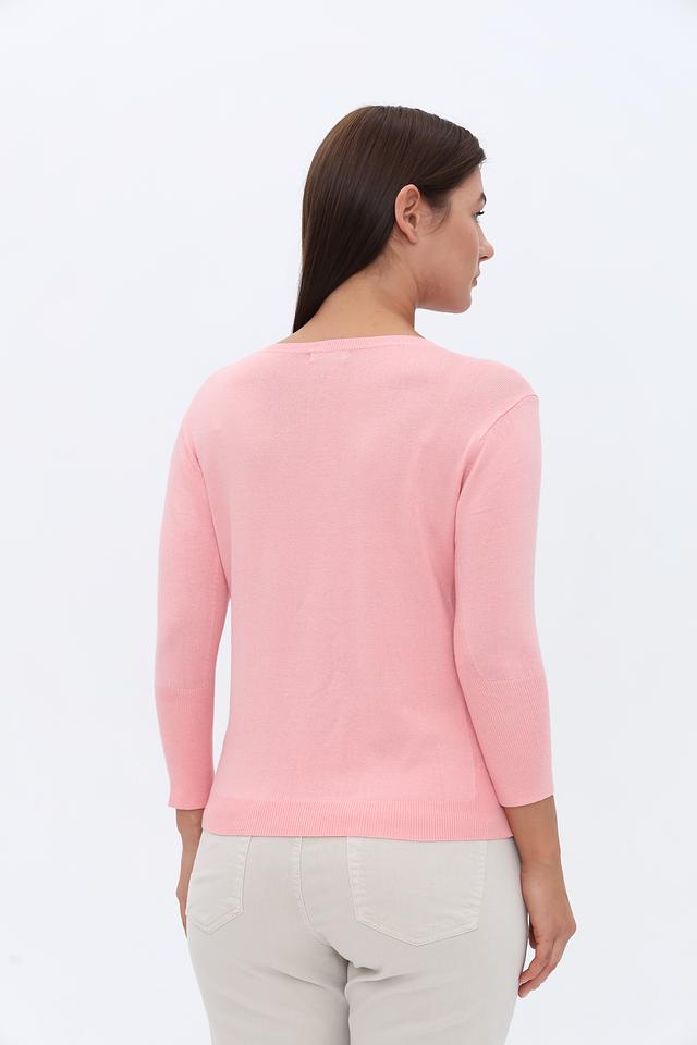 Модель имеет классический крой с округлым вырезом горловины и рукавом три четверти. Пуловер идеально подходит для создания повседневных образов, а также для более элегантных комплектаций. Он прекрасно сочетается с джинсами, брюками или юбками.