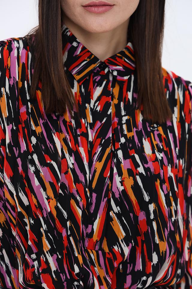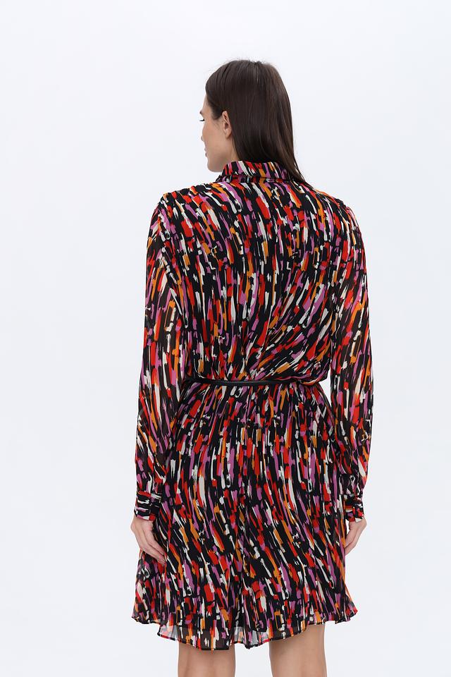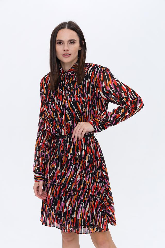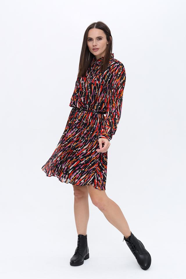 Модель имеет длинные рукава и воротник-стойку, что делает ее подходящей для прохладной погоды. Платье украшено абстрактным принтом, сочетающим в себе множество ярких цветов, таких как оранжевый, розовый, фиолетовый и черный.