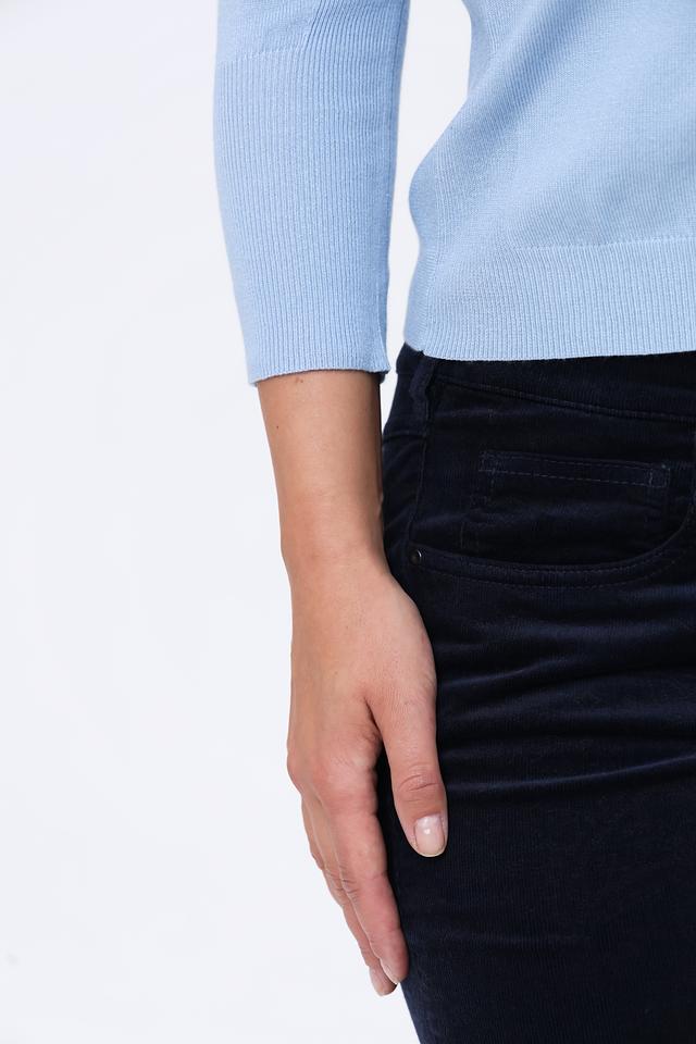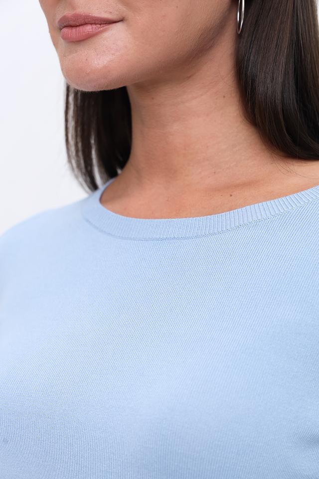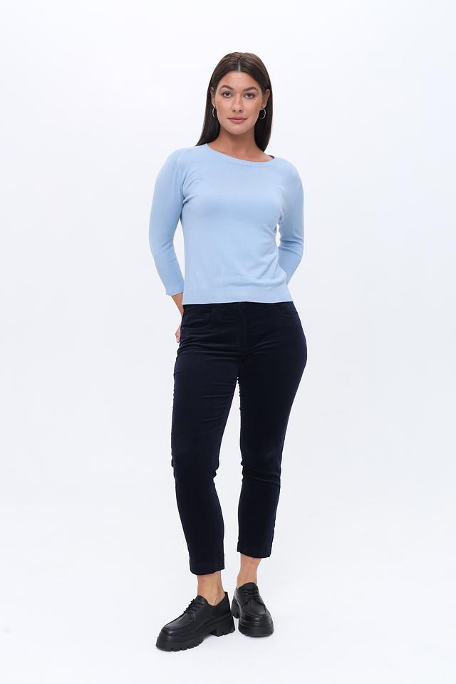 Пуловер имеет классический крой с округлым вырезом горловины и рукавом три четверти. Текстура вязки однородная, без выразительных узоров или декоративных элементов. Благодаря добавлению эластана, пуловер хорошо держит форму и не деформируется после стирки.