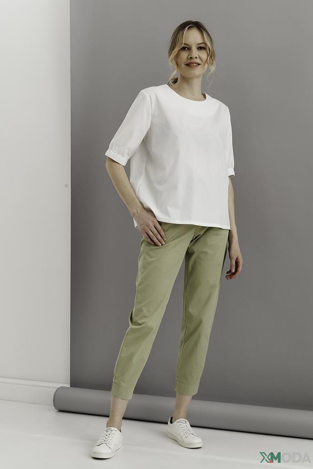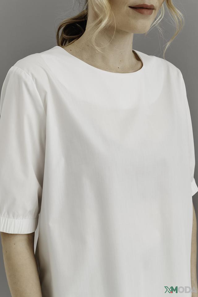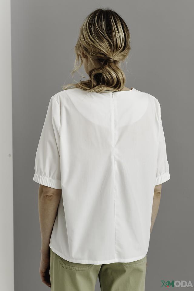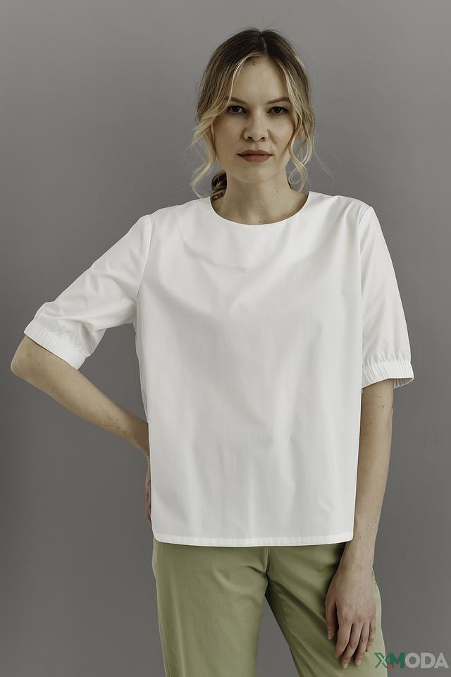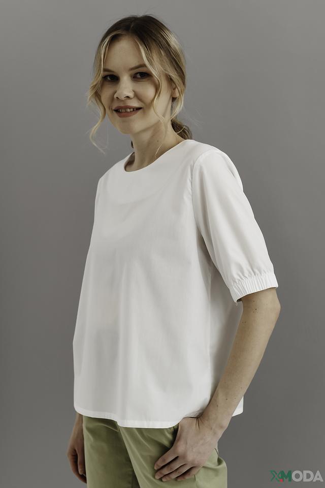 Блуза имеет прямой крой, круглый вырез горловины и короткие рукава 3/4 с небольшими сборками по плечу. Белый цвет делает ее универсальной и легко сочетаемой с различными элементами одежды.