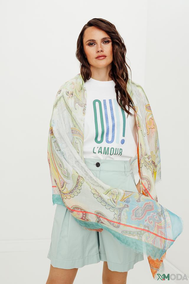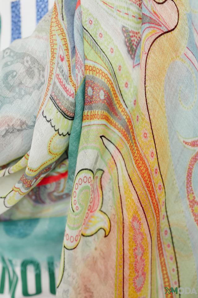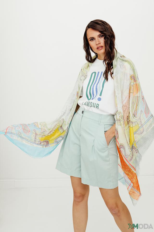 Шарф имеет легкую, воздушную текстуру и украшен оригинальным принтом, изображающим стилизованные цветочные мотивы в павлин. Преобладающие цвета – нежно-бирюзовый, кремовый, бледно-желтый и оранжевый, гармонично сочетающиеся друг с другом.