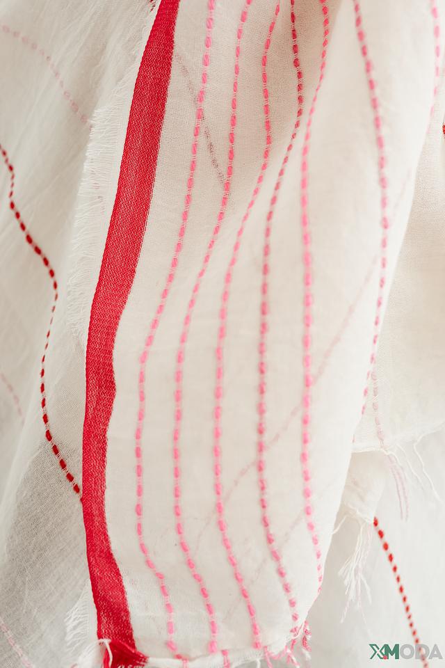 Этот шарф от Apart – идеальный аксессуар для создания элегантного и завершенного образа. Шарф выполнен в нежном кремовом цвете с деликатной полосатой расцветкой, выполненной в розово-красных тонах.