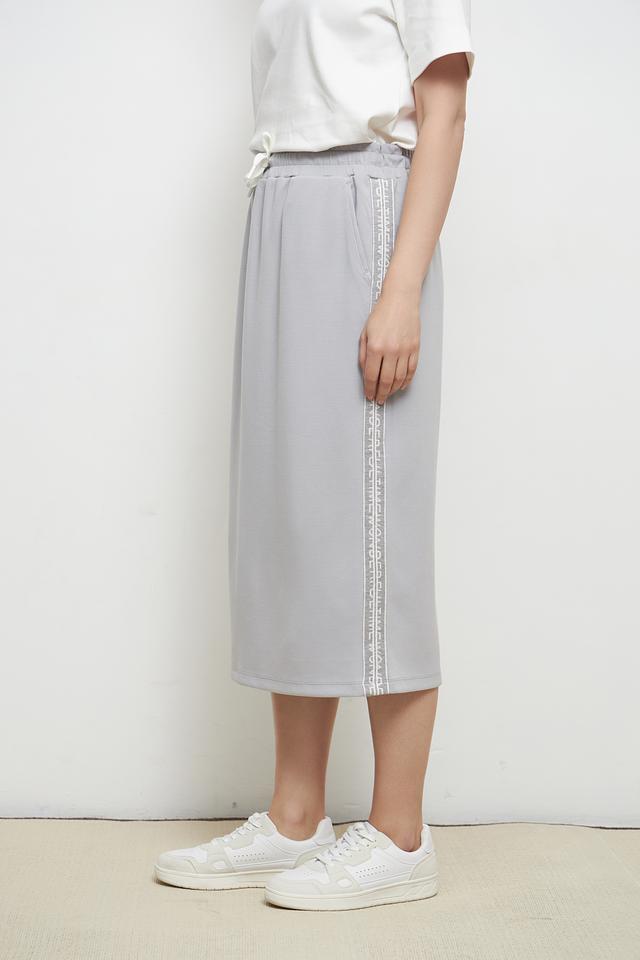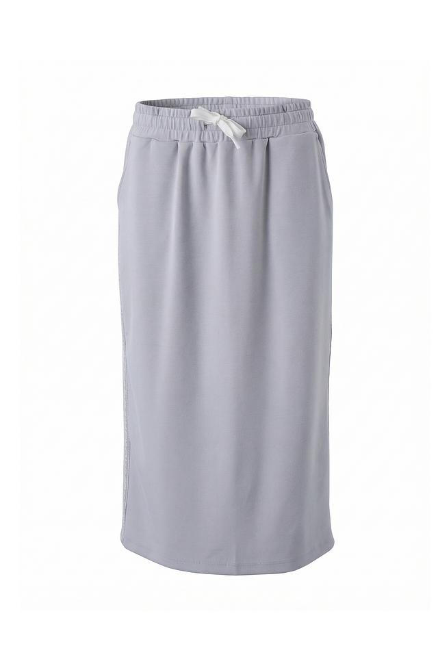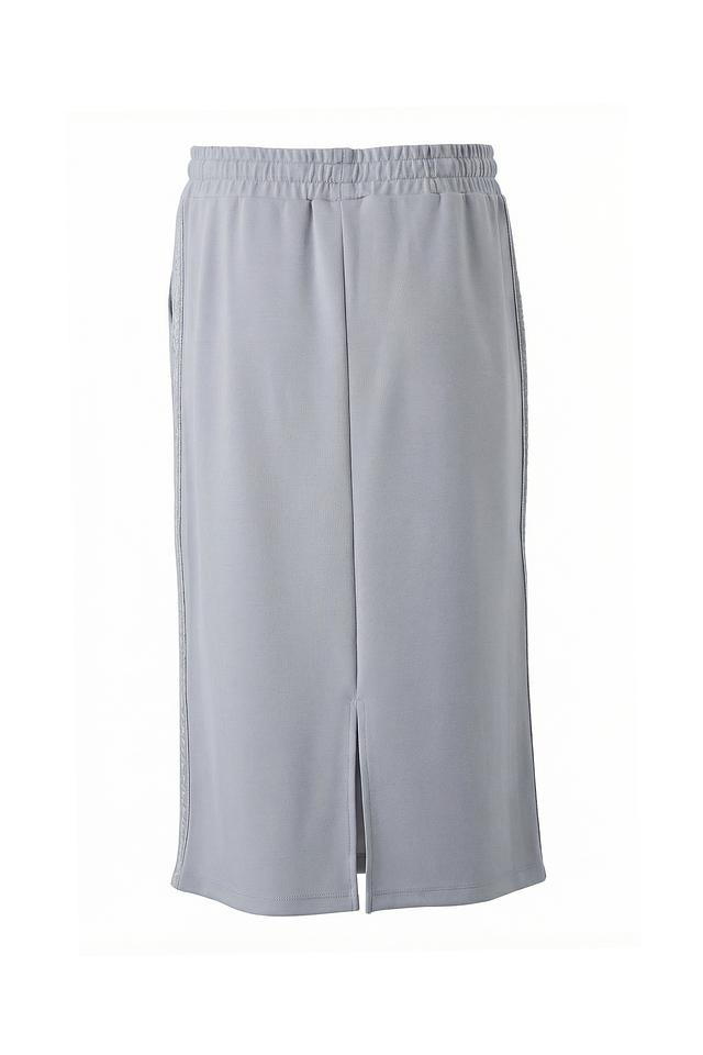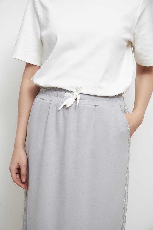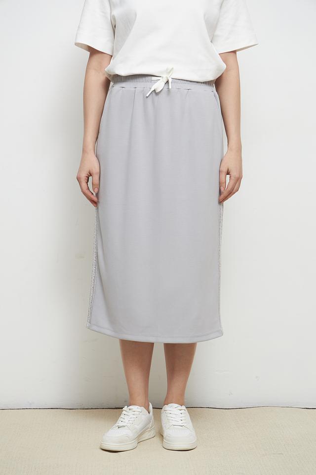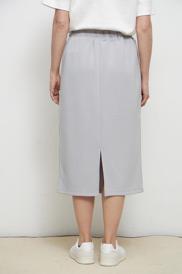 Юбка имеет миди длину и прямой крой, что делает ее универсальной для разных типов фигуры. Эластичный пояс с завязками обеспечивает комфортную посадку и подчеркивает талию. Боковая полоска добавляет акцент и делает модель более интересной.
